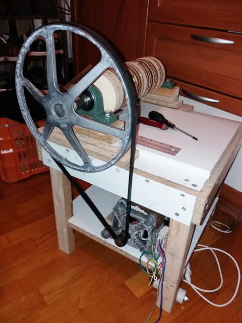 Πάντως , ἀπ' ὅτι βλέπω στήν φωτογραφία σου Νικηφόρε , ἡ τροχαλία τοῦ τυμπάνου εἶναι πολύ μεγάλη σέ σχέση μ' αὐτήν τοῦ μοτέρ , καί φοβᾶμαι πώς δέν θἀ ἔχη ἱκανοποιητική ταχύτητα τό τύμπανο , ἐνῶ θά ἔχη πολύ μεγάλη δύναμη . Ἡ ἐπεξεργασία τοῦ ξύλου ὅμως , γενικά , χρειάζεται μεγάλες ταχύτητες .