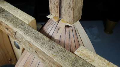 οι καπλαμάδες ΔΕΝ είναι επειδή δεν "φιλάνε" οι επιφάνειες - μάλλον τώρα πια φιλιούνται δι' αντιπροσώπου (καπλαμάς), αλλά μου συμβαίνει το εξής - κάθε φορά όμως και μου έχει σπάσει τα νεύρα : ενώ με "στεγνή εφαρμογή" (dry fit που λέει κι ο Στέργιος) οι επιφάνειες έρχονται και φιλάνε καλά, μόλις βάλω κόλλα (Titebond) το όλο πράγμα "σφίγγει" απελπιστικά γρήγορα και το αρσενικό μόρσο δεν προχωράει μέσα στο θηλυκό - ή πιο σωστά προχωράει ομαλά στα πρώτα τρία εκατοστά και μετά "σφίγγει" σταδιακά μέχρι που σταματάει 2-3 χιλιοστά πριν την ένωση. Μετά αναλαμβάνει ματσόλα, αλλιώς δεν γίνεται. Αυτή τη φορά ούτε με τη ματσόλα μπήκε - μην ανοίξει και ο τάκος. Αν φτάσει δε σ' αυτό το σημείο δεν βγαίνει κι όλας, κι έτσι αναγκάστηκα να βάλω τους καπλαμάδες. Η ένωση έγινε σφιχτή, πλαϊνά και πάτος πατάνε καλά και δεν νομίζω να υπάρξει πρόβλημα, αλλά οι καπλαμάδες μου τη σπάσανε πολύ.