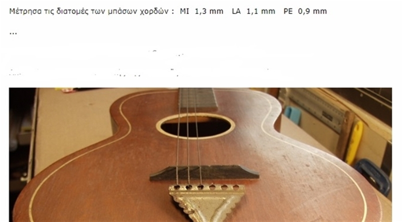 (*) Το ίδιο συμβαίνει και με τα μπουζούκια, αλλά κανείς δεν παίζει με λεπτότερες από 10άρες, παρόλο που υπάρχει σχετική μαρτυρία του Βαμβακάρη. Τα σχόλια περιορίζονται στο ότι "δεν υπάρχουν αυτές οι χορδές σήμερα". Κανείς όμως δεν ψάχνει για "καρούλι¨ 10άρι ή και 9άρι - που σίγουρα θα έβρισκε, αν όχι εδώ, στο εξωτερικό - αντιθέτως οι μπουζουξήδες βαζουν χορδές με πρώτο μέλημα τον ήχο (neorion, prodigy, ορισμένοι elixir κτλ.), ακόμα κι αν είναι ρεμπετοχτυπημένοι - δεν ξέρω γιατί συμβαίνει αυτό και υπάρχει κόλλημα με τις κιθάρες.
