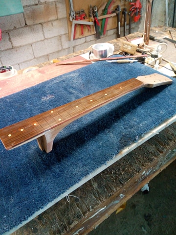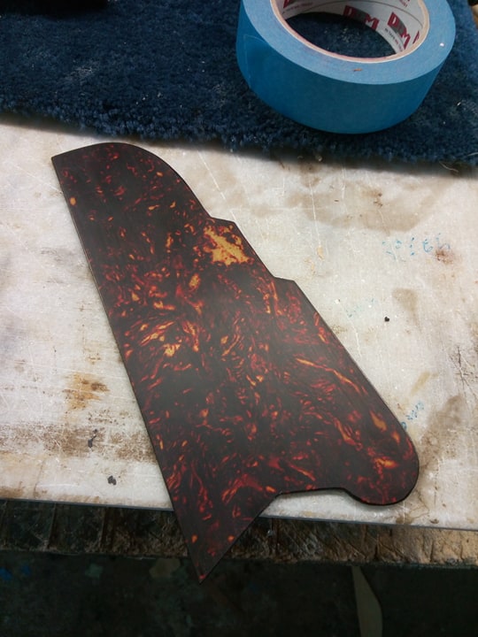 φτανουμε στην τελικη ευθεια σιγα σιγα.Και μεχρι να κολησει καλα η ταστιερα στο ηδη διαμορφωμενο μπρατσο ειπα να φτιαξω κι αυτο που ελειπε απο την κιθαρα.Ενα piguard οπως ειχαν αυτες οι κιθαρες.....στον αερα  εντελως με δυο βιδες στο καπακι και ενα λαμακι στα πλαγια.
