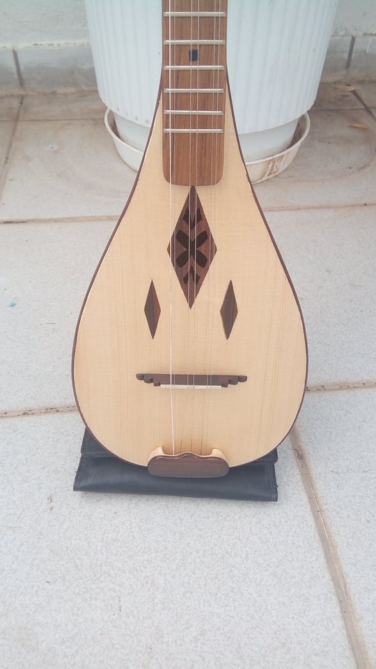 Η κλίμακα του είναι 61 εκ, το σκάφος είναι λίμπα, το μανίκι αποτελείτε από 5 τμήματα, 4 μαόνια κ το κεντρικό βέγγε, το καραολο είναι κ αυτό μαόνι, η ταστιέρα είναι τικ και τα σημάδια από έβενο, καπάκι έλατο, η τρύπα κ τα σχέδια στο καπάκι είναι από pao ferro όπως και τα πλαινά κ η κολάτζα τ σκάφους, η χορδιέρα είναι αυτοσχέδια κ οι χορδές πιάνουν σε μεταλλικά βιδωτά γατζάκια, το κόκαλο κάτω απ το καπάκι της χορδιέρας είναι για να μην πληγώσουν οι χορδές το ξύλο, ο καβαλάρης είναι κ αυτός pao ferro.