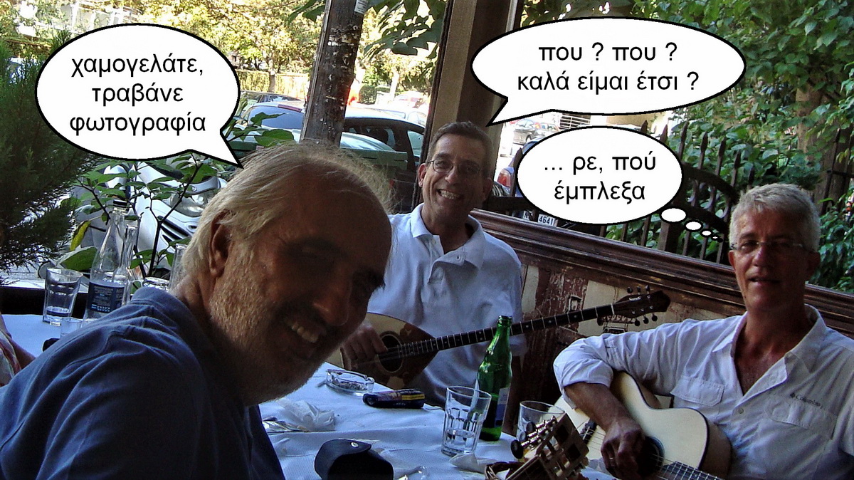 Ο Στέργιος βρέθηκε σε διακοπές στη Θεσσαλονίκη, πήρε το Μάνο και αυτός εμένα! Συνάντηση που αλλού; Σε ταβέρνα! Έτσι εκτός από τις κουβέντες για την κοινή μας αγάπη περί οργανοποιίας, εργαστηρίων, κτλ, κτλ ... έπεσαν και οι σχετικές πενιές. Παίχτουρες και οι δύο ο Μάνος και ο Στέργιος, και έτσι "τα περάσαμε όμορφα!".
