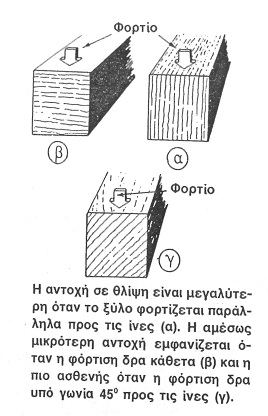 Η διεύθυνση των δυνάμεων σε σχέση με τη διεύθυνση των ινών του ξύλου: Οι αντοχές του ξύλου είναι πιο μεγάλες κατά μήκος των ινών του, δηλ. κατά μήκος του άξονα του δένδρου, και πολύ μικρότερες όταν οι δυνάμεις δρουν κάθετα προς τις ίνες.
