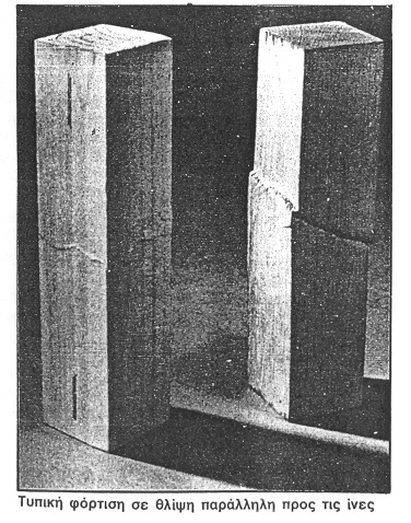 Η αντοχή αυτή είναι πολύ μεγάλη, όταν η δύναμη ενεργεί κατά τη διεύθυνση των ινών. Με γωνία μόλις 15⁰ η αντοχή μικραίνει κατά 30% και με γωνία 90⁰ δηλ. κάθετα προς τις ίνες, η αντοχή μειώνεται υπερβολικά, γίνεται σχεδόν ασήμαντη.