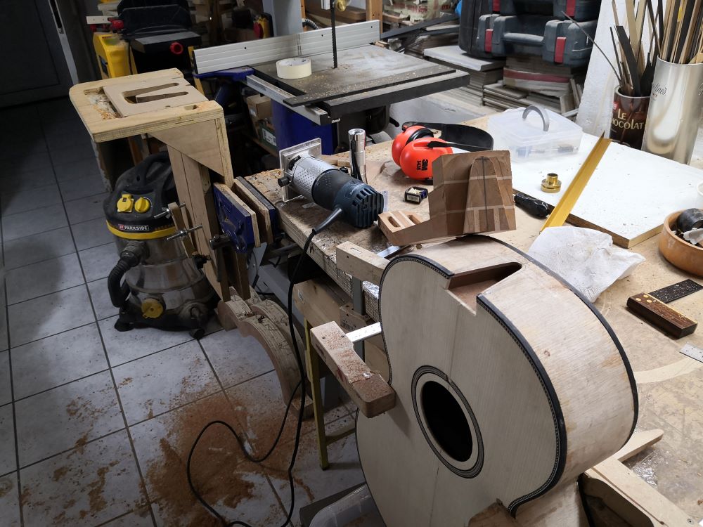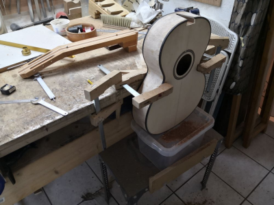 Ναι Ιωσήφ τη στήριξη την κάνω με τέσσερις σφικτήρες. Οι δύο σφίγγουν την κιθάρα και οι άλλοι δύο κρατάνε τους πρώτους πάνω στον πάγκο.
