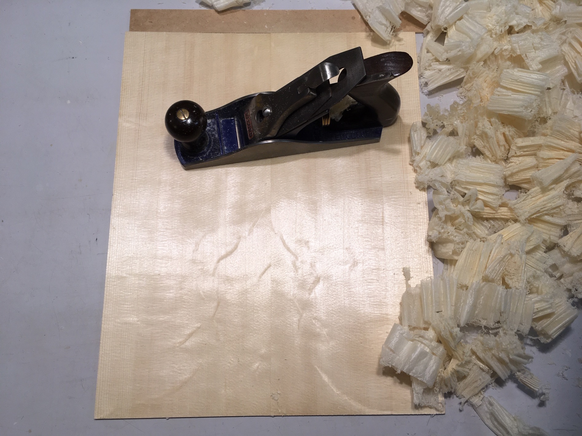 Η αρχική προεργασία έγινε με μικρή χειροπλάνη νούμερο 3 που είναι ακονισμένη καλά. Μια διαδικασία περισσότερο αγχολυτική όπως πιστεύω απ’ όσο απαραίτητη, πάντως αφήνει μια γυαλιστερή επιφάνεια που αναδεικνύει καλά τα νερά του ξύλου και διευκολύνει την απόφαση για το ποια θα είναι η “καλή” μεριά του. Θα μπορούσα να παραλείψω το πλάνισμα και να το περάσω κατευθείαν στο drum-sander (που μάλιστα η ακρίβειά του έχει υποστεί μια κοπιαστική αναβάθμιση τελευταία) αλλά οι puristas του φόρουμ θα μου το φορτώνανε στο φάκελό μου γι’ αυτό άσε, καλύτερα νάχεις το κεφάλι σου ήσυχο...