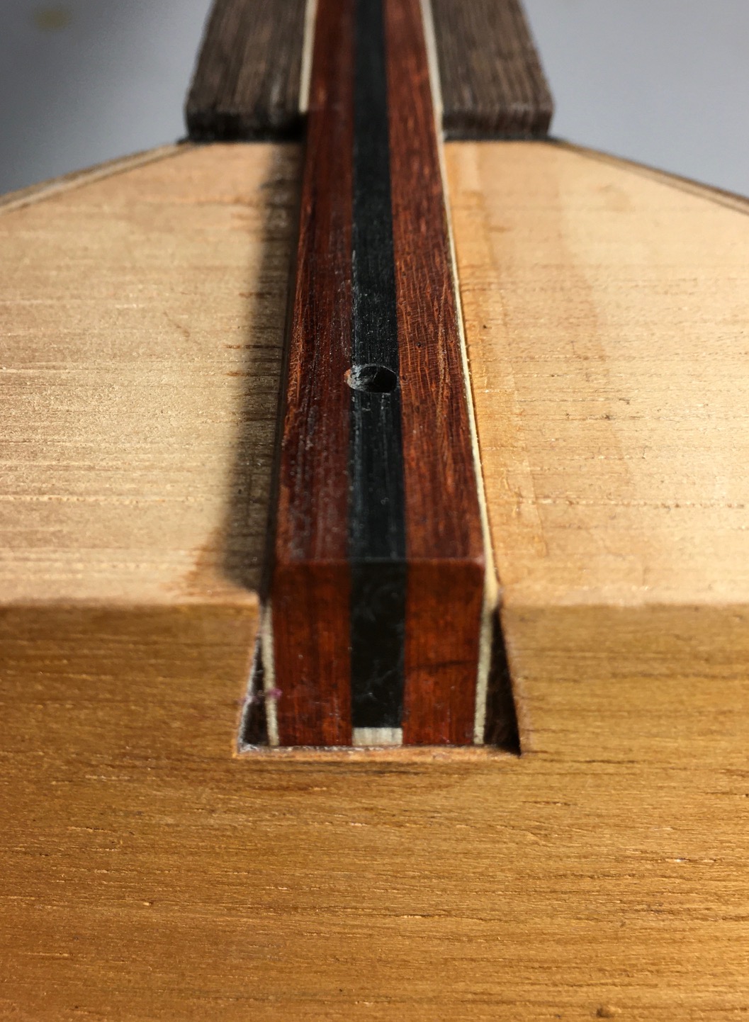 Επιπλέον, σ’ ένα τόσο στρεσσογόνο περιβάλλον όπως  είναι η περιοχή της ένωσης μάνικου-σκάφους, θα είναι πιο παρήγορο για την ταστιέρα (που θα κολληθεί αργότερα) να πατήσει κατευθείαν στον ανένδοτο σκληρό πυρήνα του μάνικου αντί στο ενδοτικό ελάτινο καπάκι. Και μια φωνή μου λέει οτι μ’ αυτό τον τρόπο η κυκλοφορία του ήχου στην περιοχή του τάκου μπορεί να γίνεται κάπως καλύτερα.