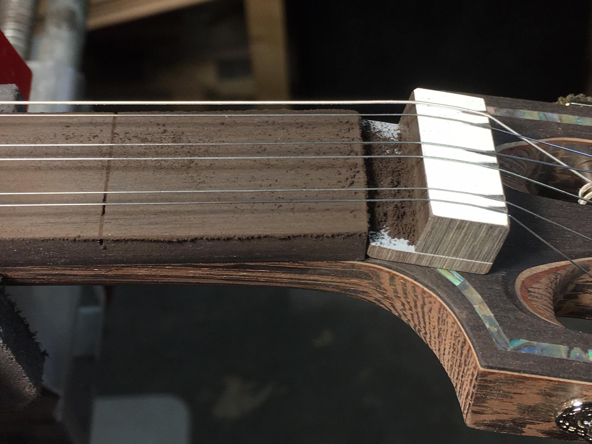Αμέσως μετά τοποθετήθηκαν τα τάστα. Και μόλις τότε συνειδητοποίησα ότι μπαίνοντας τα τάστα ασκούν κι αυτά μια τάση αντι-σκευρώματος (όσο πιο σφιχτά μπαίνουν τόσο περισσότερη). Τα τάστα που βάζω έχουν δοντάκια και μπαίνουν κανονικά -όχι σφιχτά, αλλά παρ’ όλα αυτά έκαναν ένα ελαφρό εφέ ακόμη περισσότερης αρνητικής κλίσης.
