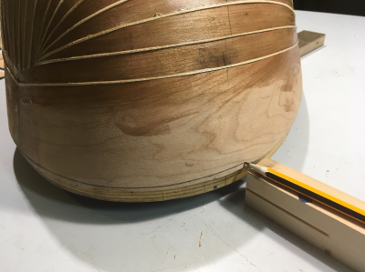 Τα ψωμωμένα φιλέτα (1,2 χιλιοστά) είναι από σφενδάμι. Τα χοντρά φιλέτα (τα είχε σχολιάσει κι ο Ιωσήφ παλιότερα) είναι άλλη μια έμμονη ιδέα μου. Αν έβαζα έτοιμα λεπτά φιλέτα σε πάχος καπλαμά θα γλύτωνα αρκετό μπελά. Αλλά τα χοντρά χειροποίητα τα βρίσκω πιο …πειστικά. Στα δικά μου μάτια δίνουν την εντύπωση ότι συμμετέχουν στη δομή του σκάφους αλλά και δημιουργούν μια εντύπωση αρμονίας στην περιοχή της ένωσης με το μάνικο. Αυτή η επιλογή κοστίζει αρκετό χρόνο για το φτιάξιμο/λύγισμα και κόλλημα ένα-ένα -ξεχωριστά από τις ντούγιες.