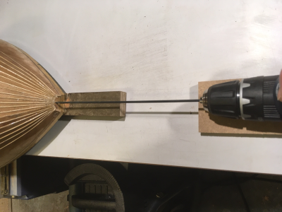 Αυτή η τρύπα χρειάζεται προ-τρύπημα. Γι’ αυτή τη δουλειά το μακρύ και λεπτό τρυπάνι (3 χιλιοστά) δίνει εύκολα την ευθεία με το μάτι -δε θέλει δα και μεγάλη ακρίβεια.