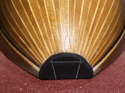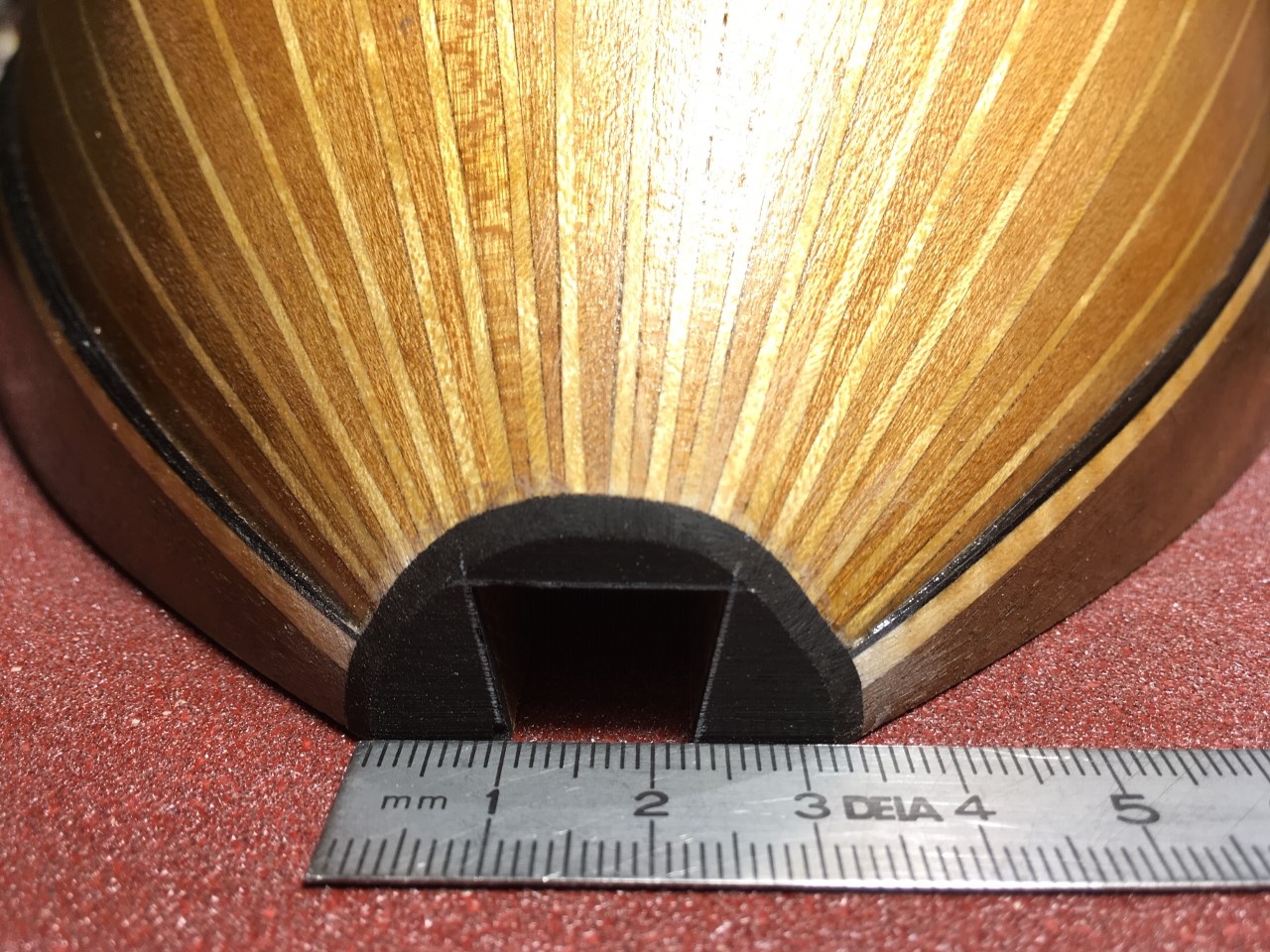 Αυτή η ένωση ζήλεψε και θέλει να εμπλουτιστεί με μια μαύρη γραμμή που θα δώσει λέει έμφαση στην περιοχή. Γι αυτό λοιπόν κολλήθηκε με ζωική κόλλα μια φλούδα έβενου πάχους 1,5 χιλιοστού και δουλεύτηκε προσεκτικά ώστε ν' αποτελεί φυσική συνέχεια του σκάφους.