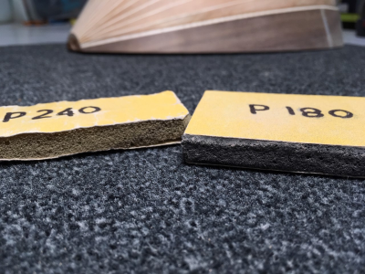 Στη γυαλοχαρτιέρα χρησιμοποιώ Ελληνικό γυαλόχαρτο Smirdex και είμαι πολύ ευχαριστημένος. Αλλά στα γυαλόχαρτα χεριού Ρ180 και Ρ240 προτιμώ τα 3M Sandblaster που έχω διαπιστώσει ότι αντέχουν πιο πολύ, κόβουν πιο γρήγορα και δε στομώνουν. Άρα έχω αποκλείσει τα υπόλοιπα και έχω εγκλωβιστεί στο πώς θα χρησιμοποιήσω τα δεδομένα γυαλόχαρτα. Έτσι λοιπόν κατέληξα να παρουσιάζω όλες αυτές τις "εξωτικές" λύσεις με τα λάστιχα και τα κολλήματα…