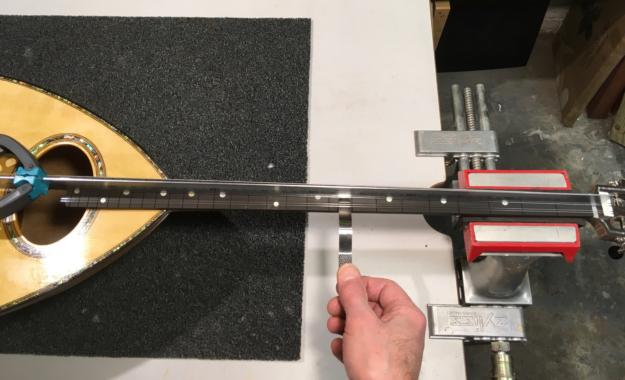 Αφού απομακρύνθηκαν οι χορδές και το όργανο χαλάρωσε και πάλι, διαπίστωσα ότι η ταστιέρα είχε μια ομαλή κύρτωση καθ’ όλο το μήκος της που η κρέμασή της έφτασε μέχρι 1,3 χιλιοστά παρακαλώ!