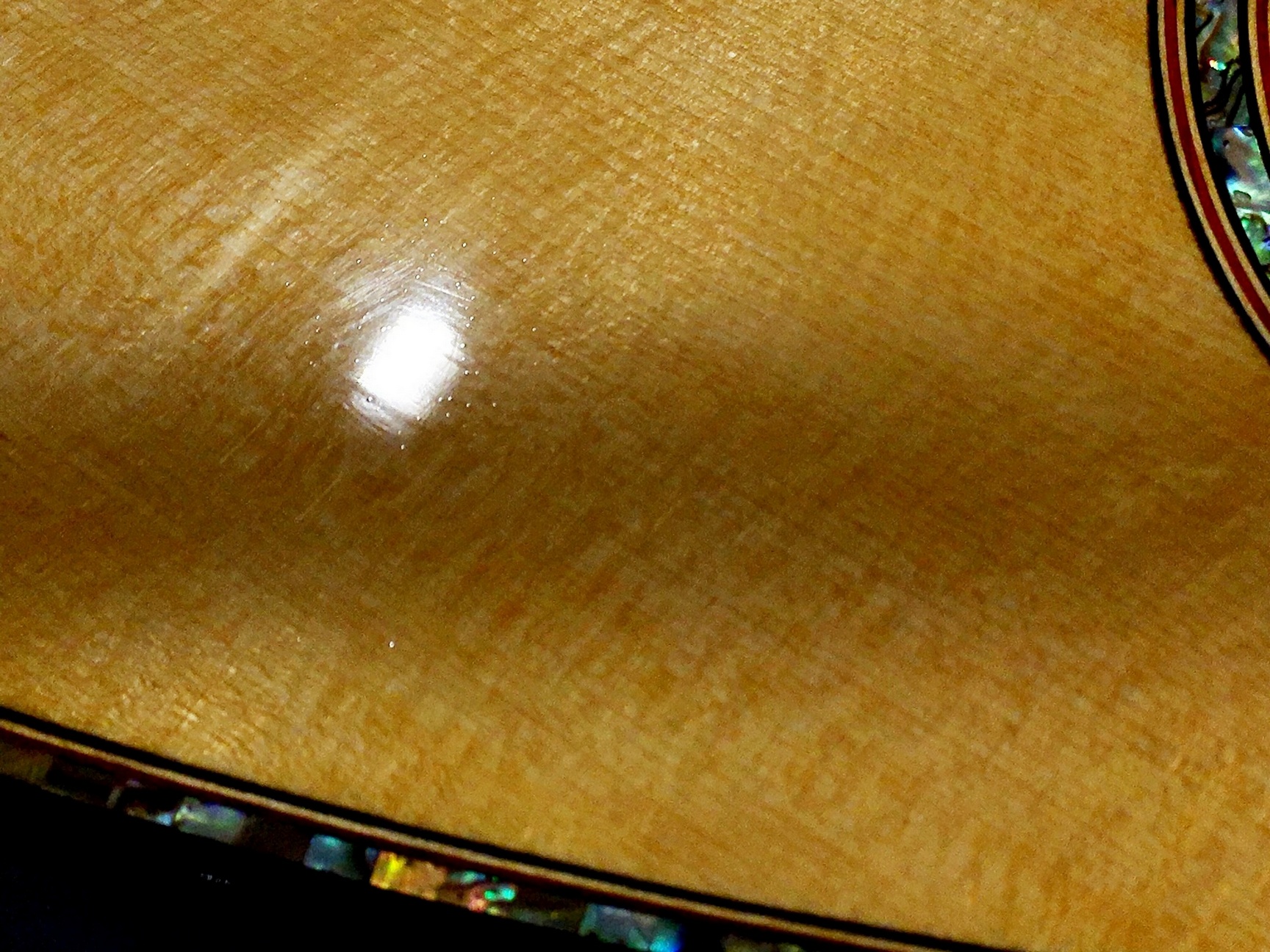 Μετά από δύο ημερών στέγνωμα και χωρίς άλλη κατεργασία (σμυριδαλοιφή ή/και κέρωμα με ρητίνη), η επιφάνεια έχει αυτή τη μορφή που φαίνεται στη φωτογραφία και για μένα είναι ικανοποιητική. Με προσεκτική παρατήρηση και καλό φωτισμό ξεπηδάνε μικρο-ατέλειες που δεν εγείρουν όμως σοβαρές ενστάσεις, απλώς προστίθενται σ’ αυτό που λέμε εμπειρία.