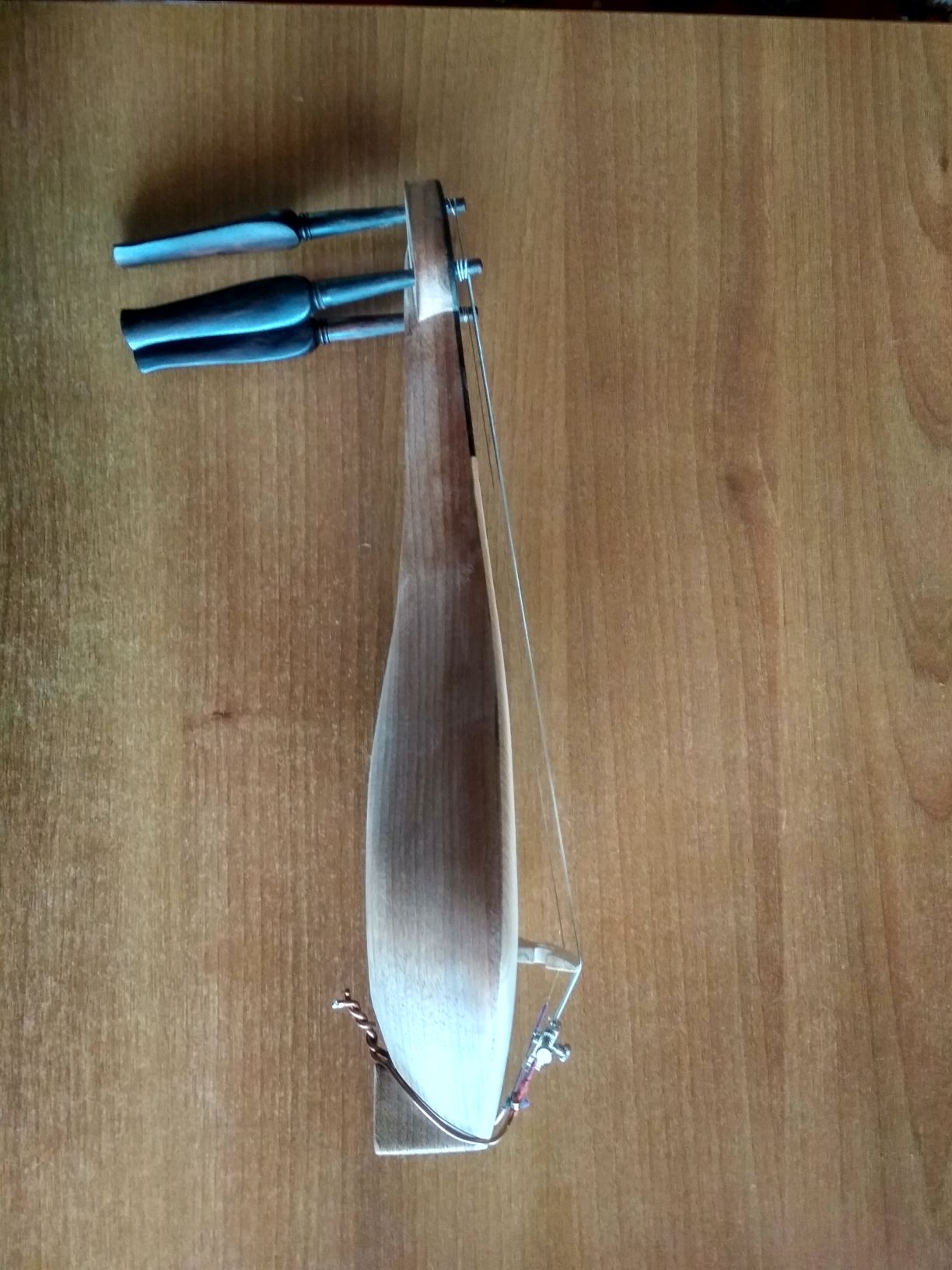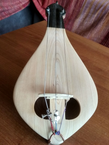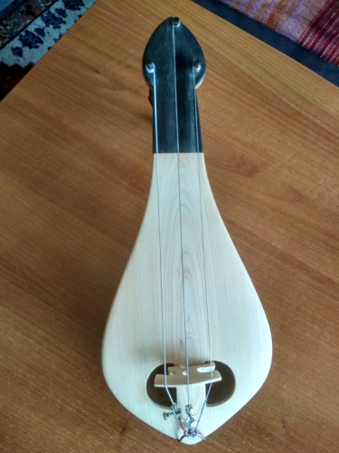 Αυτή είναι η δεύτερη λύρα μου αλουστράριστη ακόμα. Βγήκε απο το ίδιο στάμπο με την πρώτη οπότε έχει και τα ίδια προβλήματα. Μικρό στο μηκος του σκάφος και στενό μανίκι. Επίσης την εσκαψα βαθιά και δεν είχα περιθωριο για το σκάψιμο απέξω στο πισω μέρος του σκάφους.Της έδωσα πάντως μεγαλύτερη κλίση και δεν ψηλώνωουν οι χορδές όταν πλησιαζεις προς τον καβαλάρη. Σαν ήχος είναι παρόμοια με την πρώτη. Δηλαδή αξιοπρεπής χωρίς να είναι κατι ιδιέταιρο νομίζω. Το σκάφος είναι μαόνι εμπορίου, το καπάκι κυπαρίσσι και η γλώσσα έβενος. Τα κλειδιά τα πήρα έτοιμα. Το καπάκι όπως βλέπετε έιναι ''λάθος''. Δέν με έφτανε το πάχος να το κόψω στη μέση και να το κάνω διπλό οπότε μπηκε όπως ηταν . Παρόλαυτα δεν είδα κάποια σημαντικη διαφορά στον ήχο σε σχέση με την πρώτη μου.