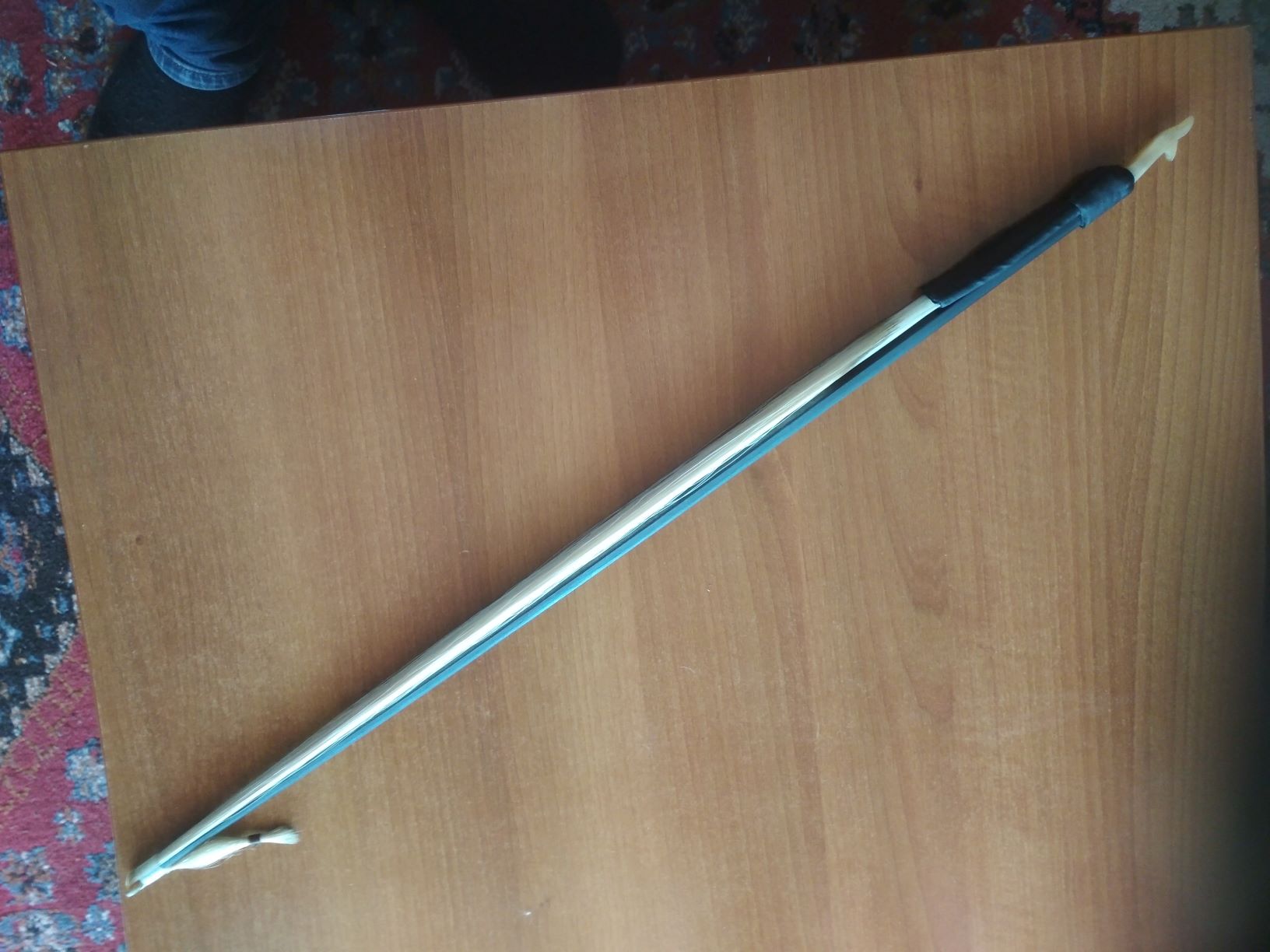 Τώρα , θά σοῦ δείξω , ὅπως σοῦ ὑποσχέθηκα τόν " μηχανισμό " τεντώματος τῆς τρίχας τοῦ δικοῦ μου δοξαριοῦ , καί σύ κάνε ὅπως θέλεις . Πάντως , ὀ τρόπος πού συγκρατοῦνται οἱ τρίχες στό δικό σου δοξάρι , εἶναι ἁπλούστατος , καί μπορεῖς νά πάρης μιά ίδέα ἀπ' τόν ἀντίστοιχο τρόπο τοῦ δικοῦ μου .
