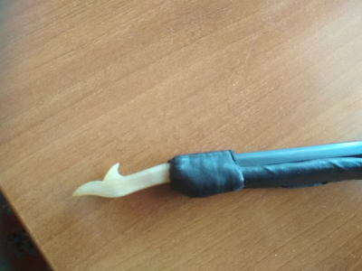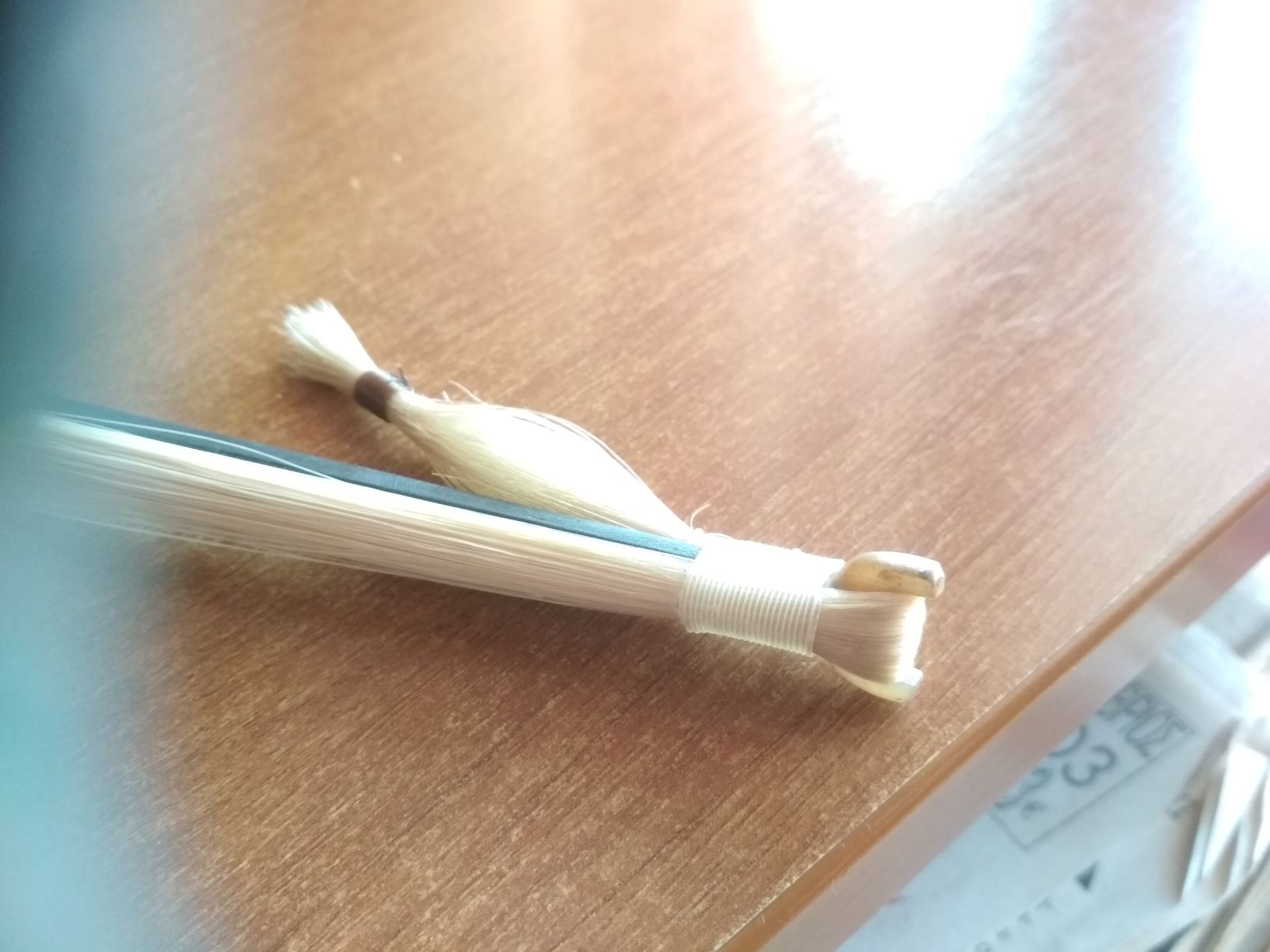 Ἐκεῖ πού ἀρχίζει ἡ τρίχα ( 2η φωτογραφία τοῦ προηγουμένου μηνύματος ) , κάτω ἀπ' τό κοκκαλένιο καπάκι μέ τίς 2 μαῦρες λεπτές καβίλιες , ὑπάρχει σφηνοειδής τρῦπα ὅπου εἰσάγουμε τήν ἄκρη τῶν τριχῶν δεμένη καί στερεωμένη σ' αὐτήν μέ λεπτή σφήνα . Στό τέλος περνοῦμε ὅοοοοολη τήν τρίχα μέσα ἀπ' τήν ὀπή τοῦ κοκκαλένιου καπακιοῦ τό ὁποῖο κολλᾶμε μέ ψαρόκολλα . Σέ περίπτωση ἀλλαγῆς τρίχας , ἁπλῶς ξεκολλᾶμε το κοκκαλένιο καπάκι .