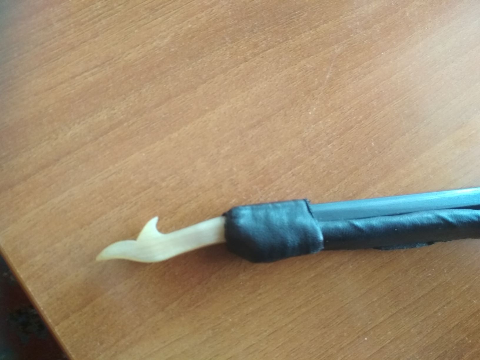 Στό ἐπάνω μέρος πρῶτα , ἀπ' ὅπου θά ξεκινάει ἡ τρίχα : Ὅπως εἶναι κομμένο τό ξῦλο σάν ὀρθογώνιο , κολλοῦμε δεξιά του καί ἀριστερά του δύο λεπτές φέτες ξύλου ἤ κοκκάλου ( μᾶλλον τό δεύτερο ) διαστάσεων : μήκους 2 ἑκ . , φάρδους 6 - 7 χιλ. καί πάχους 1 - 2 χιλ. , ὥστε νά δημιουργηθῆ στό τέλος τοῦ δοξαριοῦ κάτι σάν ὕψιλον ( Υ ) , σάν δύο κερατάκια δεξιά καί ἀριστερά του . Ἡ κόλληση γίνεται καλύτερα μέ ψαρόκολλα , ἀπ' τά 2 ἑκ. τοῦ μήκους τους μόνο τό μισό ἑκατοστό θά ἐξέχη ἀπ' τό δοξάρι , τό ἑνάμισυ θά εἶναι κολλημένο σ' αὐτό . Ἐπίσης , ὅταν κολλήσουν τά 2 κοκκαλάκια , τρύπησε προσεκτικά τήν κάθε πλευρά μέ τρυπανάκι 1,5 χιλ. σέ δύο σημεῖα της , καί μπῆξε μέ κόλλα λεπτές ἰσόπαχες καβίλιες πού θά φτιάξης ἀπό κόκκαλο ἤ σκληρό ξῦλο ἤ ὀδοντογλυφίδα κατ' ἀνάγκη , πού θά πιάνουν κόκκαλο καί ξῦλο γιά νά μή ξεολλήσουν ποτέ . Αὐτά τά κοκκαλάκια τά βάζουμε γιά νά συγκρατεῖται ἡ τρίχα στό σόκορο τοῦ δοξαριοῦ .