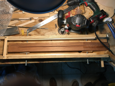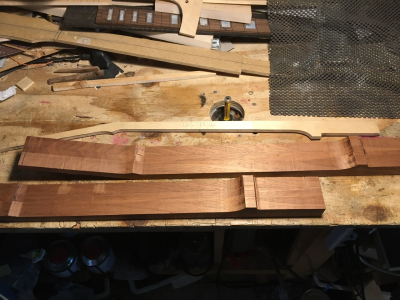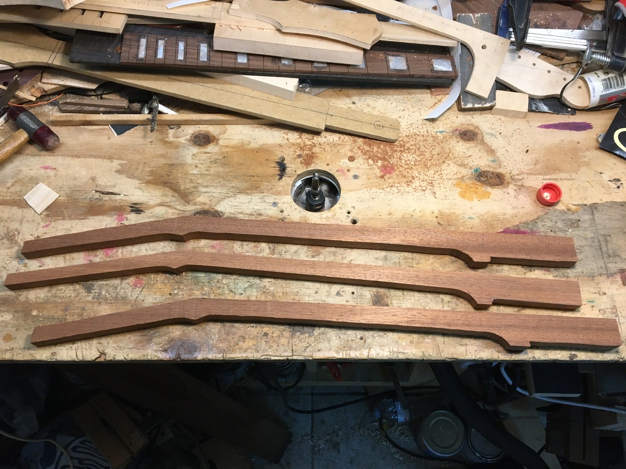 φτιάχτηκε νέο template για το προφίλ του μπράτσου, εφαρμόστηκε σε ένα μαδέρι μαόνι 19mm και κόπηκαν τα κομμάτια , το 2ο (μεσαίο) με ανάποδη φορά πάνω στο μαδέρι, κολήθηκαν και ξεγυρίστηκαν με το ρούτερ, φτιάχτηκαν δύο μπράτσα😎