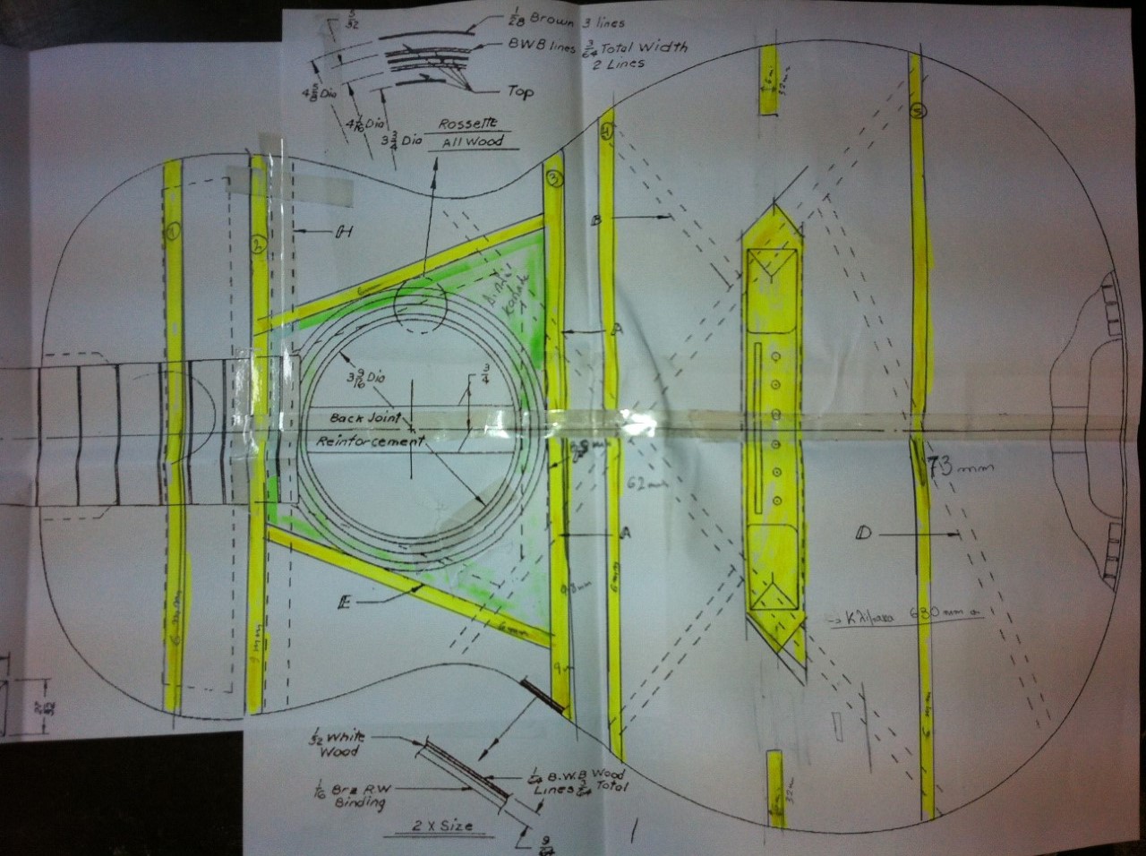 Στο σχέδιο φαίνεται το  αρχικό καμάρωμα της Μάρτιν και με κίτρινο υπογραμμισμένο το καμάρωμα όπως το σχεδίασα για ρεμπετοκιθάρα. Η αλήθεια είναι πως στο μήκος η κιθάρα βηγήκε περίπου 1,5 εκατοστό πιο μικρή κατα μήκος σε σχέση με το αρχικό σχέδιο λόγω κάποιων μικρομετατροπών και αβλεψιών που έκανα στο καλούπι. Παρόλ'αυτά κράτησα την αρχική κλίμακα 630 χιλιοστά με κάποιες μικροαλλαγές στο σχήμα.