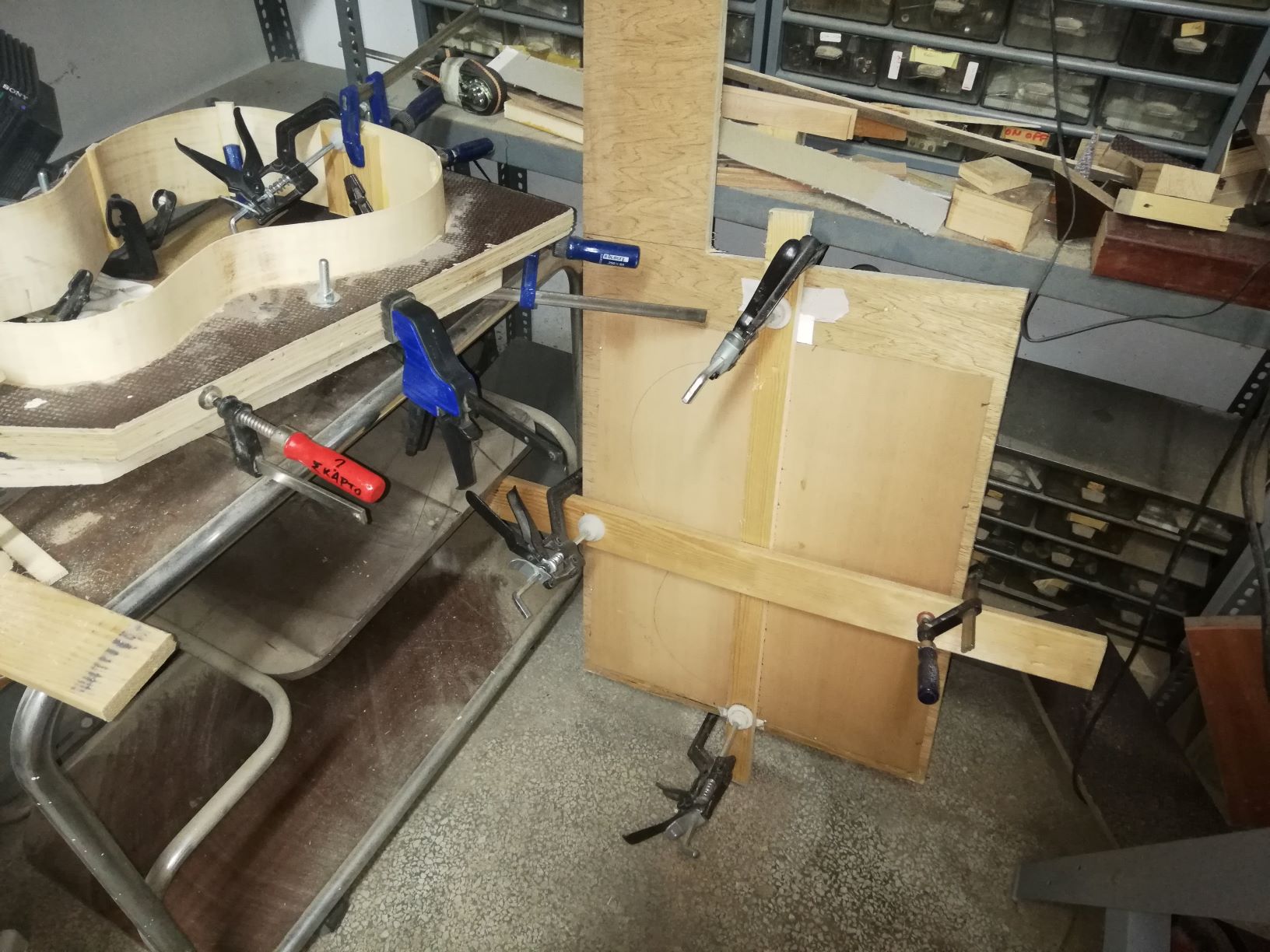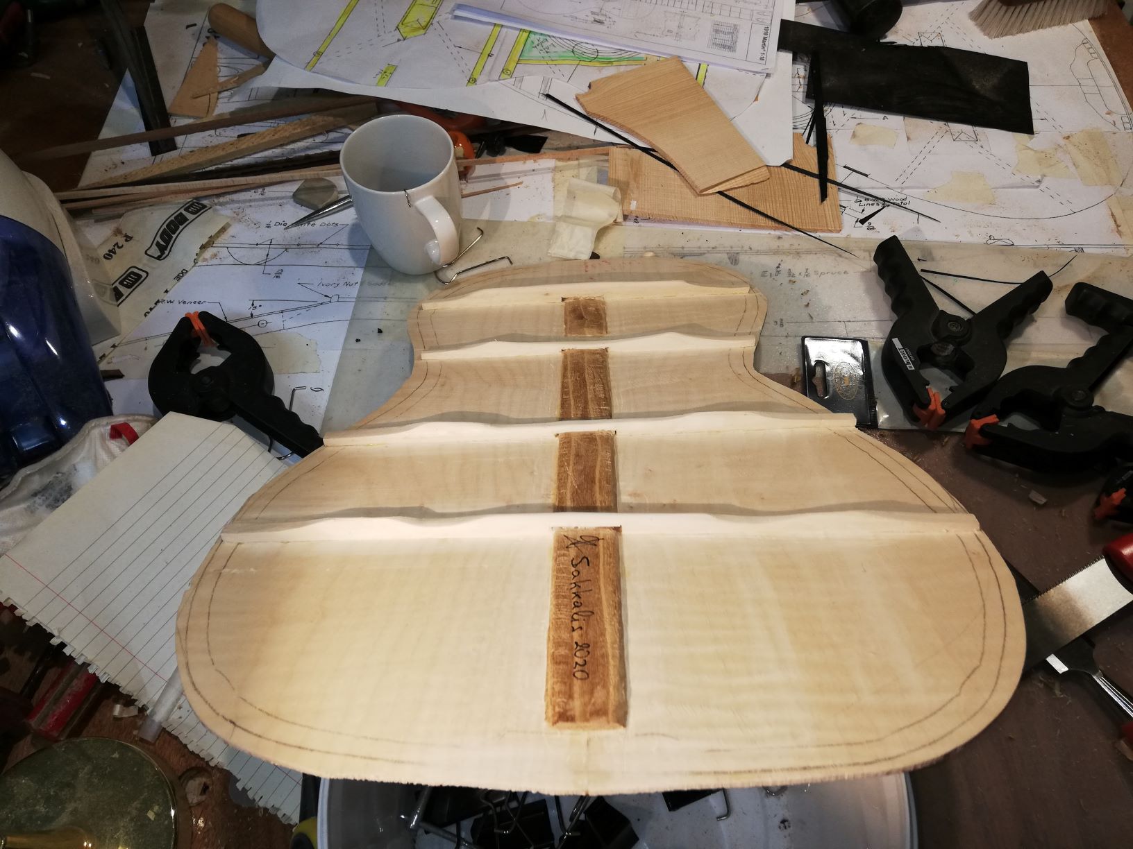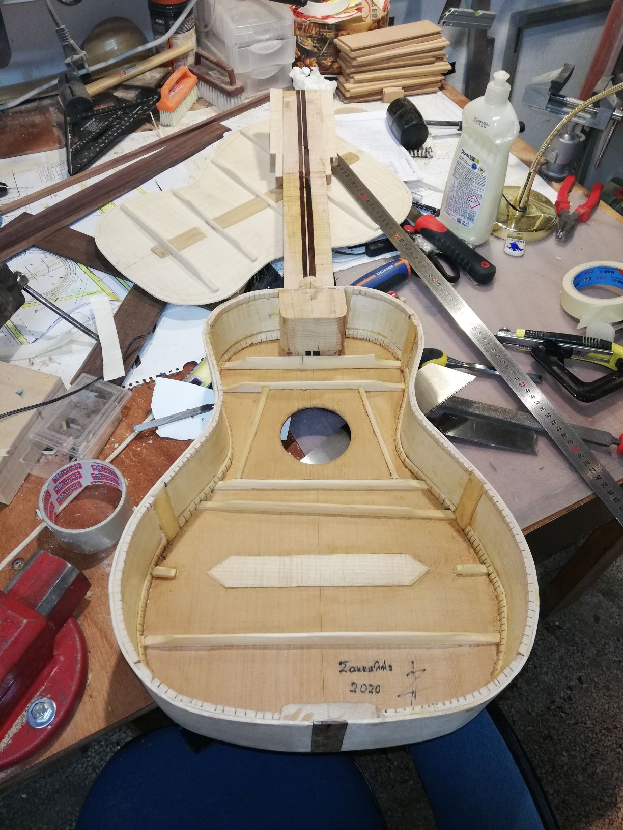 Κολληθήκανε και καμάρια από φλαμούρι που σχηματοποιηθήκανε σε σχέδιο δικού μου σχεδιασμού για να ελαφρύνουν. Τα καμάρια είχανε ελαφριά κούρμπα στην λογική που κάνουμε την κούρμπα στα καπάκια των μπουζουκοειδών. Δεν χρησιμοποίησα την λογική του radious που συνηθίζεται στις κιθάρες καθώς δεν είχα φτιάξει το κατάλληλο εργαλείο.
