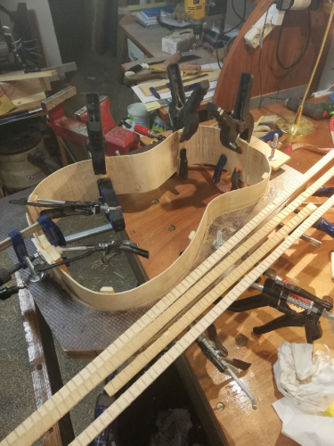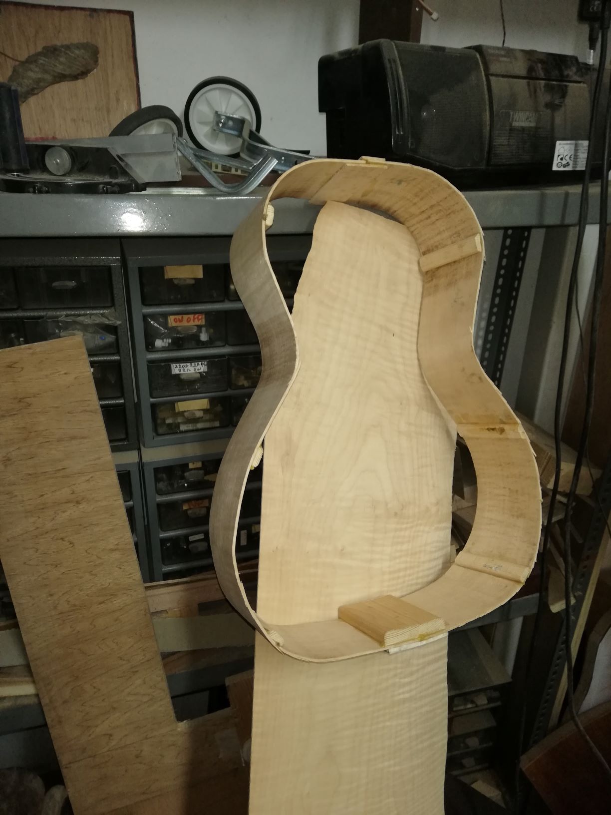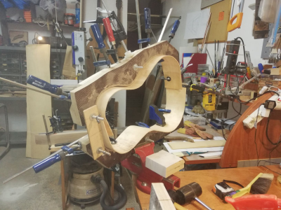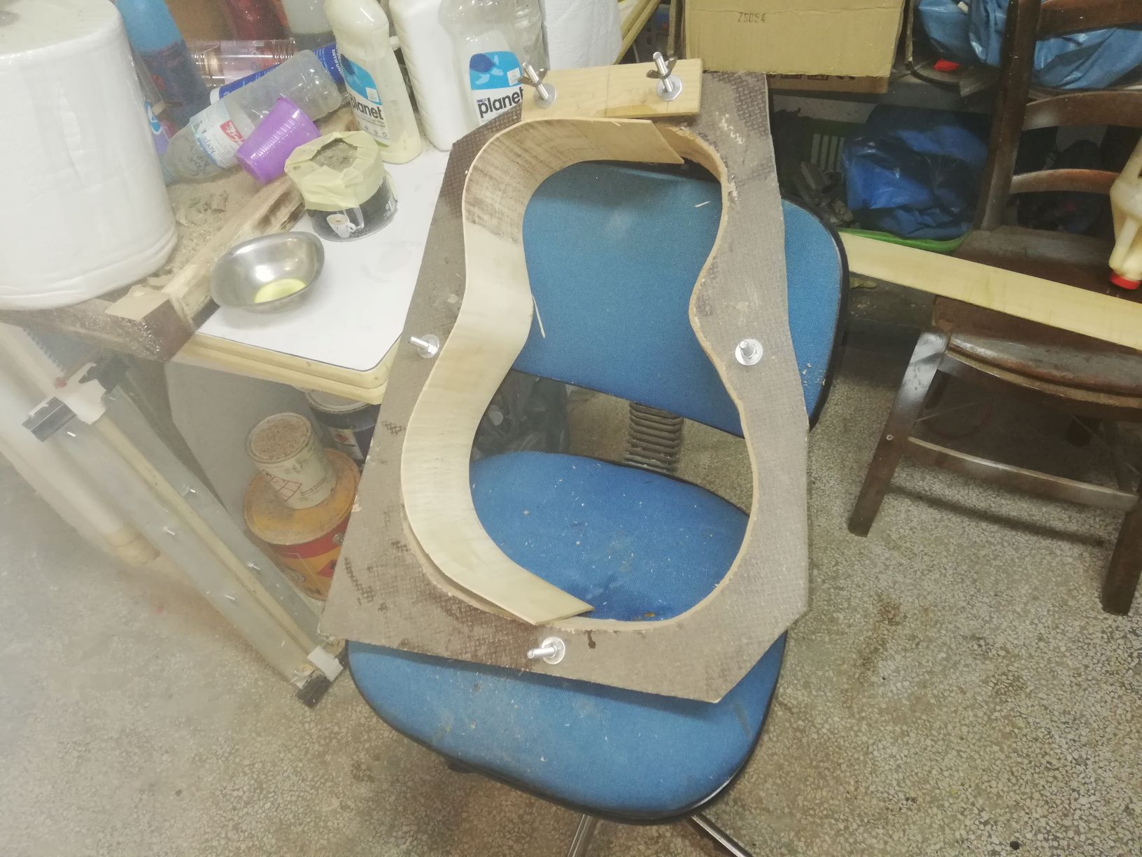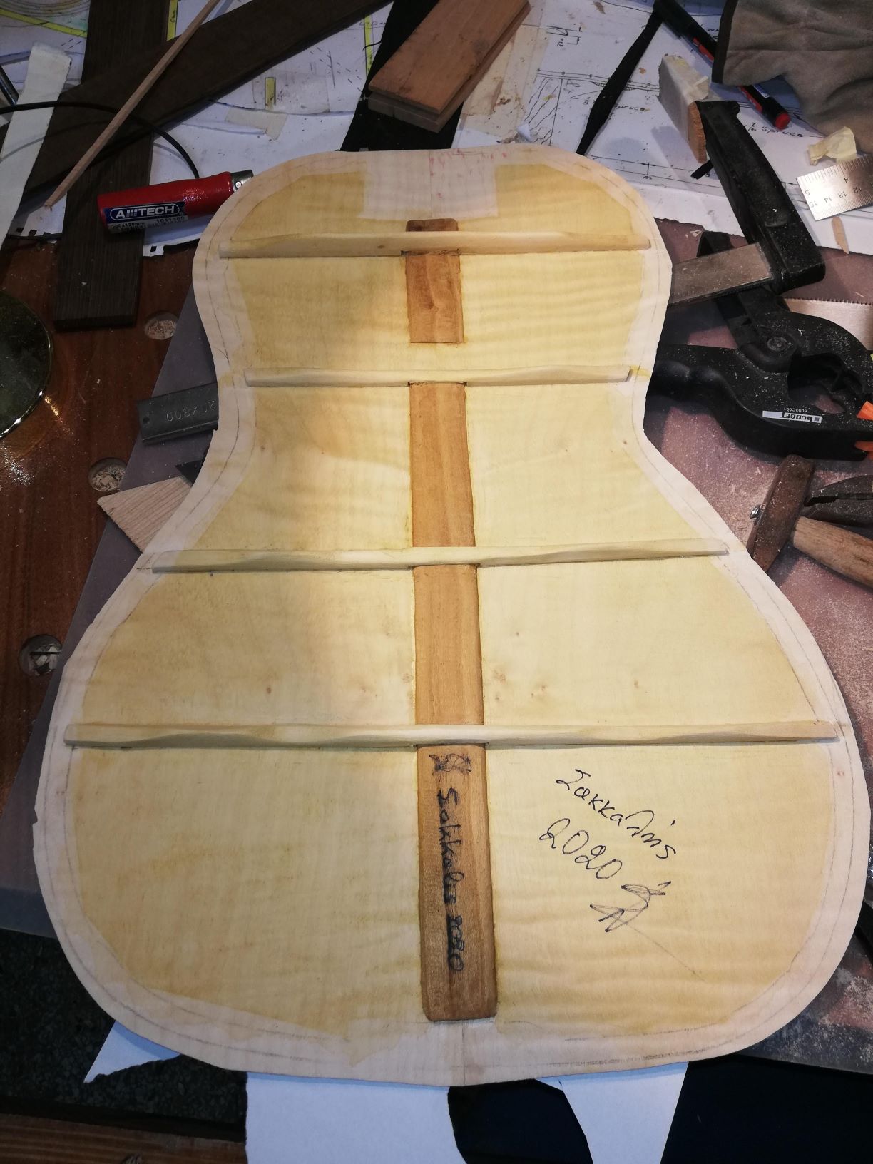 Κολληθήκανε και καμάρια από φλαμούρι που σχηματοποιηθήκανε σε σχέδιο δικού μου σχεδιασμού για να ελαφρύνουν. Τα καμάρια είχανε ελαφριά κούρμπα στην λογική που κάνουμε την κούρμπα στα καπάκια των μπουζουκοειδών. Δεν χρησιμοποίησα την λογική του radious που συνηθίζεται στις κιθάρες καθώς δεν είχα φτιάξει το κατάλληλο εργαλείο.