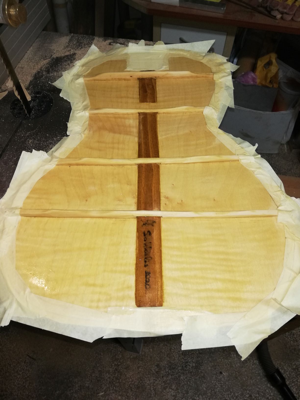 Στις φωτογραφίες φαίνεται το φύλο κελεμπέκι που κόπηκε η πλάτη της κιθάρας, καθώς και τα γυρισμένα πλαϊνά.