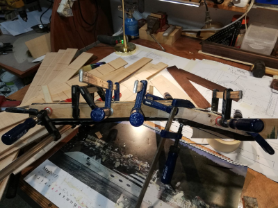 Ενώθηκε το μάνικο με το σκάφος (καπάκι - πλαϊνά). Στον τάκο από κελεμπέκι που ενώθηκε με το μάνικο για να γίνει και το τακούνι έγινε αυλάκι ούτως ώστε να μπει συρταρωτά στα πλαϊνά. Το αυλάκι αυτό όπως έιχα δει σε κατασκευές γίνεται πιο φαρδύ για να μπει άνετα το μάνικο. Έτσι και έκανα. Μετά είχα σκοπό να το σταθεροποιήσω με καπλαά από κελεμπέκι να μπει σφηνωτά στο αυλάκι.