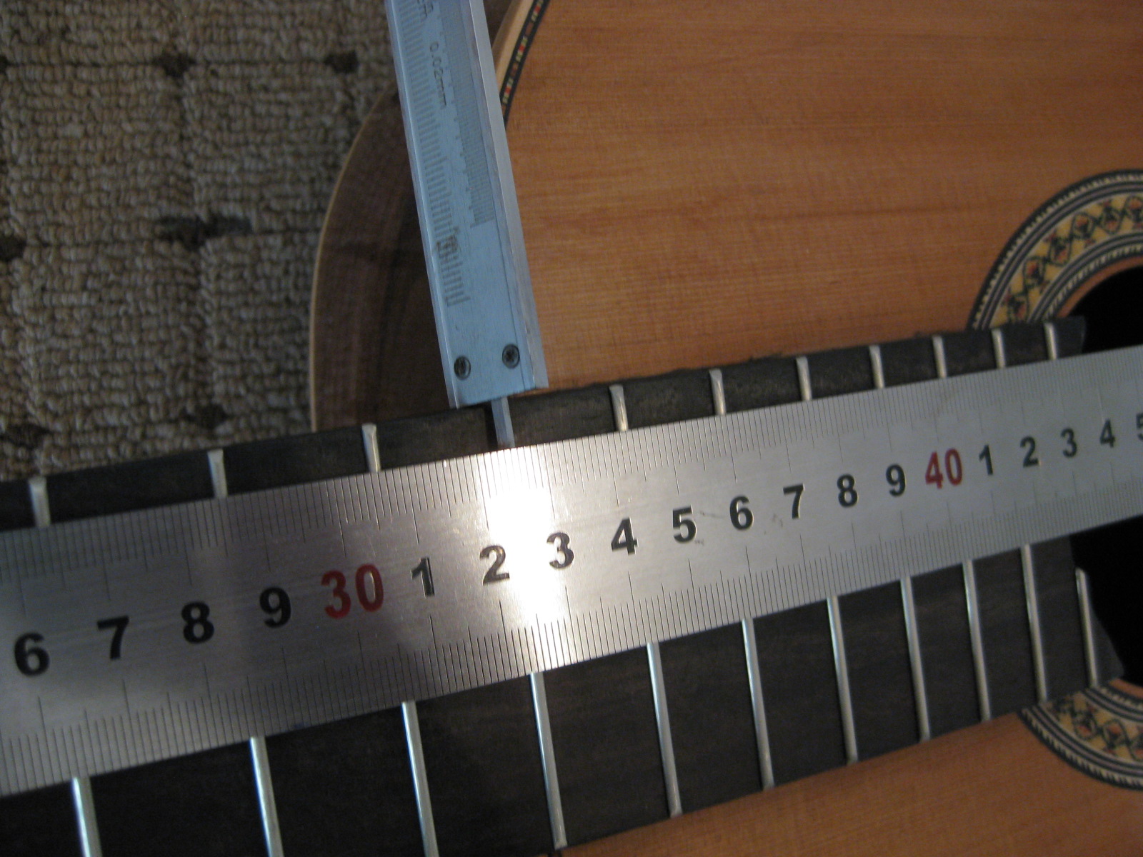στη πραξη τωρα, αυτο που κανω ειναι να βαζω το χαρακα στη πρωτη χαρακια-πανω απο τη 1η τρυπα στο καβαλαρη, και να τσεκαρω στο 12 ταστο ποσο διαστημα εχει η αποληξη στη ταστιερα, κανω το ιδιο στην 6, και εκει που εχει την ιδια αποσταση εκει πρεπει να μπει.