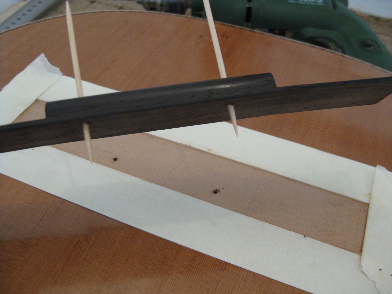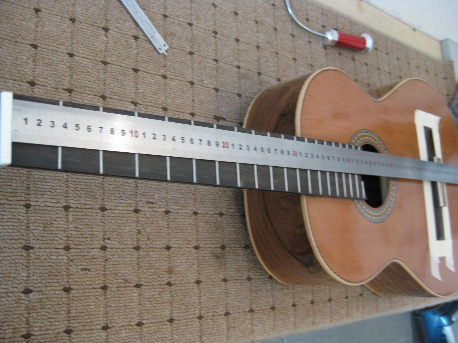 ο[/size]δηγος στελιου βημα-βημα για τοποθετηση καβαλαρη στη κλασικη:[/size][/size]1. αφου εχουμε γυαλισει τη κιθαρα - καβαλαρη, βαζουμε το χαρακα να πατησει στο πανω κοκκαλο (0) και βαζουμε το κατω κοκκαλο στα +2 χιλ απο τη κλιμακα στην 1 και +3χιλ στην 6 χορδη, στη δικια μου περιπτωση 65.2-65.3, βαζω πολλες χαρτοταινιες στη πισω μερια του καβαλαρη για να μη γλυστρισει πισω (την κιθαρα την εχω ακουμπησει σε λιγο υψος το κεφαλι, ειναι επικλινεις).κατοπι βαζω και απο μπροστα αρκετουτσικες χαρτοταινιες.τσεκαρω αν μπορει να "γλυστρισει" πανω κατω ο καβαλαρης η τον συγκρατει η ταινια. αν δεν παει πουθενα ειναι οκ, σταματαω να βαζω αλλες μη μας ξαναπιασει κανενας κορονοβαϊρος κ μου τελειωσουν  :cheesy2:    τις ταινιες δεν τις κολλαω σουπερ καλα, μονο την πρωτη  περιμετρικα εξαρτατε κ απο το βερνικι, γιατι εχει μια ταση κατα το ξεκολλημα να "τραβαει" λιγο το βερνικι η να του αφηνει μια θαμπαδα.οποτε ειναι σημαντικο να ειναι σουπερ στεγνα τα λουστρα -λεμε τωρα....απο τη πρεμουρα μου παντα τη 2η μερα το κανω... κ οπως εχω μιλησει με αρκετους, ολοι βιαζομαστε σ αυτο το σταδιο για να μπουν οι χορδες να την ακουσουμε (τη κιθαρα)...-  χορδες να την ακουσουμε (τη κιθαρα)...-