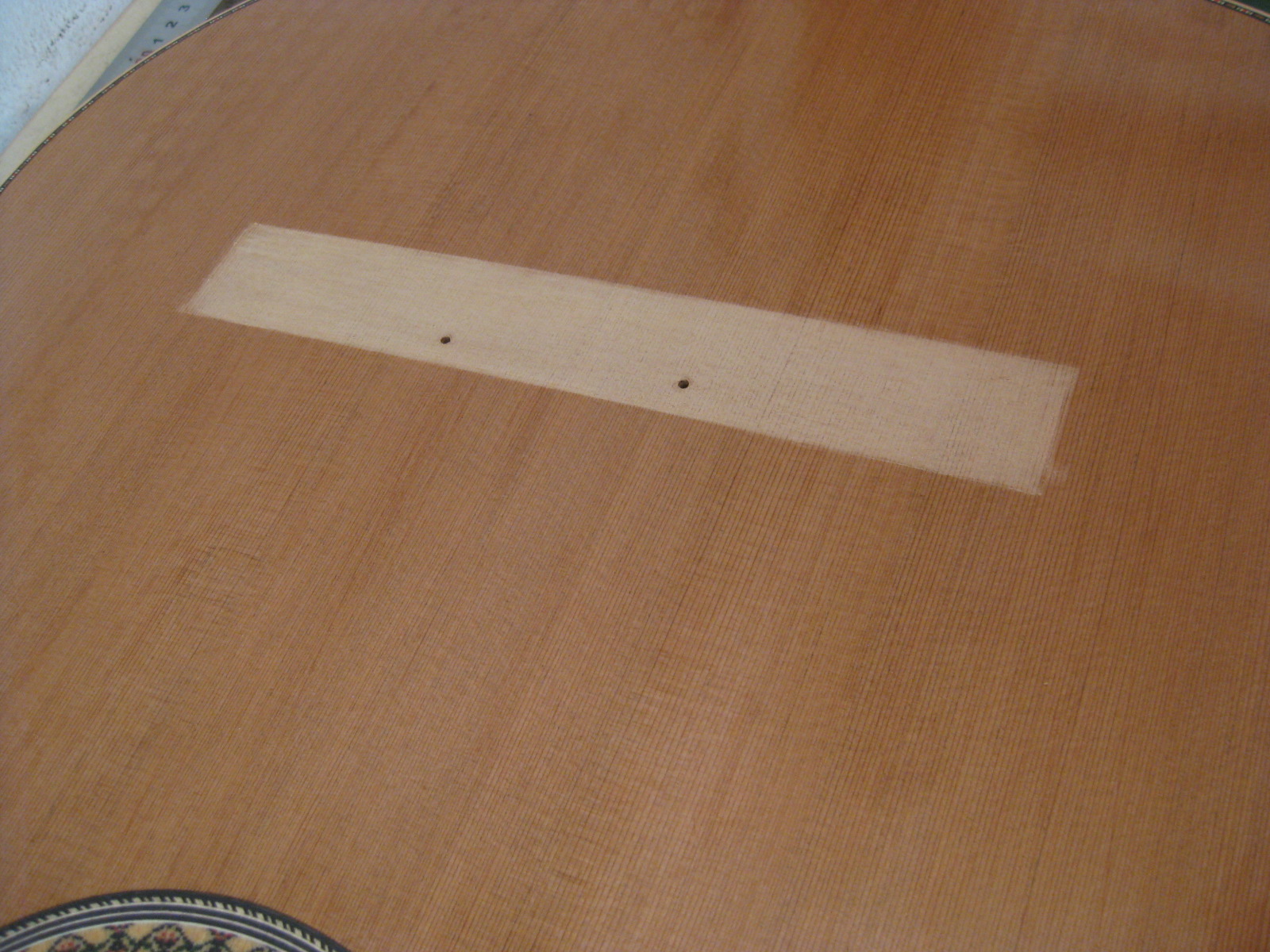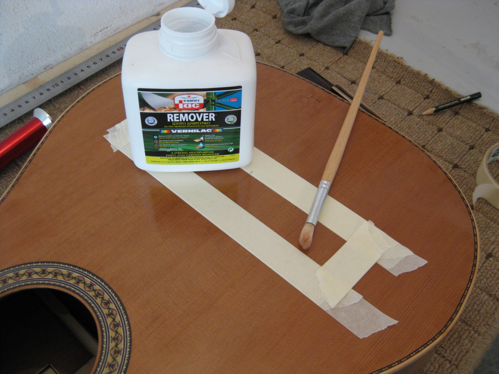 3. στη συνεχεια πρεπει να αφαιρεσω το λουστρο στην επιμαχη περιοχη. εδω να πω οτι εφτιαχνα παλαιοτερα λουστρο τη κιθαρα, με καλυμενη τη περιοχη με χαρτοταινια, ωστε μετα το λουστρο, απλα ξεκολουσα τη χαρτοταινια κ φαινοταν το ξυλο καθαρο απο κατω, ομως το εγκατελειψα , γιατι λιγο το πανω-κατω, λιγο το μπρος-πισω, για την ακριβεια της θεσης λεω, στο τελος μικραινα τη θεση της χαρτοταινιας ολο κ πιο πολυ...