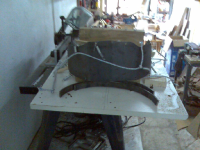 καταρχάς νά ευχαριστήσω τό φίλο vaggnes πού είχε τήν ευχαρίστηση νά ανεβάση τίς φωτο. Θά σάς πώ τώρα τόν τρόπο πώς θά τό κάνεται ή επυτιχία είναι 100% σίγουρη.Τά έξοδα κατασκευής του είνε μόνο η αγορά  6 ελατηρίων έλξεως περίπου 25 έως 30 κε τά οποία εύκολα μπορείς νά βρής καί είναι καί φθηνά.Εγώ βαρέθηκα νά πάω σέ μαγαζί εδώ στήν Θεσσαλονικη νά παρω γιατί ήταν καί λίγο μακρυά μου καί έτσι έβαλα λάστοιχο.ΛΟιπόν ξύλο νοβοπάν καλύτερα όμως φορμάικα 50χ60 .στό κέντρο βάζουμε ένα οδηγό γιά νά κάθετε τό καλούπι καί νά είναι σταθερό όπως ακριβώς κάθετε επάνω στή μόρσα .Μπροστά τοποθετούμε ένα ξύλο γιά κόντρα καί επάνω βιδώνουμε τά πιαστράκια γιά νά πιάνουν τά ελατήρια.Πέρνουμε καί ένα ρετάλι λαμαρίνα περίπου 1,5 μμ από ένα σιδεράδικο από αυτά πού πετάνε περίπου 60χ20 κε.Μετά τό κόβουμαι μέ τήν σέγα αφού βάλουμε τό πριονάκι γιά σίδερο καί τό κόβουμε στό πατρόν τίς κολάντσας κατά περίπου 2 κε μεγαλύτερο από ότι είναι η κολάντσα. Αφού τό κόψουμε τό λυγίζουμε πάνω στήν μόρσα αφού βάλουμε ένα στόγγυλό σολήνα στήν μόρσα καί τού δίνουμε τό σχήμα τού καλουπιού μας όπωσ ακριβώς βλέπεται στό σχέδιο. Κάνουμε δέ καί έξη τρύπεςδυο επάνω δύο κάτω καί από μία στά πλάγια γιά νά κουμπόνουν τά ελατήρια.Αυτό καθαυτό είναι τό εργαλείο. Τώρα πώς λειτουργεί.Αφού τελειόσουμε τό σκάφος τό αφήνουμε στό καλούπι μιά η δύο μέρες γιά νά στεγνώση η κόλα καλά .Τό τρίβουμε στό μέρος πού θά κολιθή η κολάντσα μέ ξύστρα μαραγγών καί μετά μέ γιαλόχαρτο πολύ καλά γιά να γίνη λείο .λυγίζουμε ήν κολάντσα μέ τό εργαλείο πού είδατε ποιό πάνω την κεντραρουμε μέ μιά γραμμή στό κέντρο κάθετα καί αφού την αλοιψουμε μέ αρκετή κόλα τήν τοποθετούμε επάνω στό καλούπι μέ τό σκάφος . Δέν χρειάζετε νά τρέχουμε μήν μάς στεγνώση η κόλα μέ το πάσο μας τήν πιάνουμε στή γραμμή πού τραβήξαμε μέ δυό καρφάκια πολύ ψυλά βελονάκια καί τα στραβώνουμε προσεκτικά νά μήν κάνουμε ζημιά στό σκάφος ετσι η κολάντσα τώρα βρίσκετε κεντραρισμένη στόν τάκο τού σκάφους.  Βρέχουμε μέ νερό από έξω τήν κολάντσα καλά καί πέρνουμε τό καλουπι μέ τήν λαμαρίνα τήν τοποθετούμε επάνω στήν κολάντσα καί τήν πιάνουμε από τα γαντσάκια τά ελατήρια κολάντσα + μπροστινό τάκο εναλαξ πρώτα από κάτω μετά από επάνω καί από δίπλα Τά ελατήρια τώρα ενεργούν τραβώντας τκαλούπι πρός τόν μπροστινό τάκο.Η κόλα έχει ίδη παγώση καί θά πρέπει νά τήν επαναφέρουμε στήν υγρή μορφή.Γιαυτό πέρνουμε ένα φλόγιστρο μικρο οτιδήποτε και ζεστένουμε την λαμαρίνα μέχρι νά ζεσταθή καλά αλλά όχι καί νάτήν κοκινίσουμε μιά θερμοκρασία γύρο στίς 6ο έως 7α βαθμούς είναι καλά.Μέ τόν τρόπο αυτό πετυχαίνουμε 1ον νά ενεργοποιήσουμε τήν κόλα 2ον νά ζεστάνουμε τήν κολάντσα καί συνχρόνως τό νερο πού βρέξαμε τήν κολάντσα, τά ελλατήρια νά  κάνουν τή δουλειά όπως κάμνουμε καί εμείς στό λύγισμα τής ντούγας.Αυτή φίλοι συνφορουμίτες είναι μία ιδέα δική μου καί τό κυριωτερο είναι ανέξοδη  απλή στήν εφαρμογή καί η απόδωση τέλεια ΧΡΗΣΤΟΣ