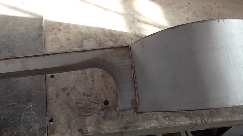 Τίς δύο καταλήξεις τῶν πλαϊνῶν στό πίσω μέρος τοῦ τάκου , ἄν καί τίς εἶχα κολλήσει μαζί μέ τόν τάκο ἀπό μέσα καί μέ τό φιλέτο ἀπ' ἔξω καί ἔχοντας μάλιστα ἀντικρύσει καί τά νερά τοῦ ξύλου , ἀναγκάστηκα νά νά τά ξεκολλήσω καταστρέφοντας τήν ἔνωση , διότι δέν εἶχα δώσει μιά ἐλαφριά καμπύλη στήν ἔξω μεριά τοῦ τάκου , ὥστε νά γίνη καί ἐλαφριά καμπύλο τό τμῆμα τῆς ἐνώσεως τῶν πλαϊνῶν ἐκεῖ , ὅπως πηγαίνει δηλαδή φυσιολογικά τό σχῆμα τῆς κιθάρας . Ἐκεῖ ἔγινε ἕνα ἄσχημο ἐπίπεδο . Ἔτσι , ἀφοῦ ἔκξοψα δύο κομμάτια ἀπό τίς ἄκρες , σημπλήρωσα τό κενό μέ ἕνα μακρόστενο , λίγο φαρδύστενο κομμάτι μέ φιλέτο στή μέση , πού θλέλει καί ἀρκετό μπάλωμα.....: