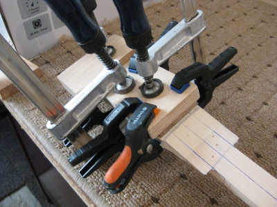 άλλαξα τρόπο, τα πιάνω και τα δυο μαζί, έτσι ώστε τα σόκορα που θα φιλήσουν μεταξύ τους να είναι "περασιά" όσο γίνεται. Τα στερώνω με σφιγκτήρα οριζόντια πάνω στον πάγκο - πρέπει όμως να είναι επίπεδος - βάζοντας ένα κομμάτι mdf από κάτω (μεταξύ καπακιών και πάγκου). Τα πιάνω έτσι ώστε τα σόκορα της μακρυάς πλευράς των κομματιών να εξέχουν από το πρόσωπο του mdf κατά 1-2 εκ., είναι "στον αέρα" δηλαδή.