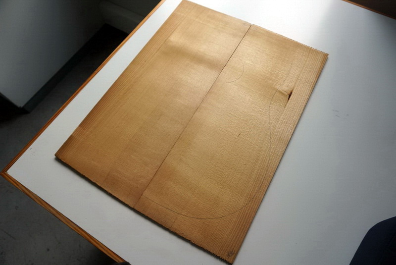 Πιστεύω όμως ότι έπαιζε ρόλο και το ξύλο. Αυτό είναι ένα καπάκι "παλαιωμένου έλατου" από τον Μαυρομουστάκη. Γερμανικός έλατος, με επεξεργασία στη Γερμανία. Ο Σάκης μου είπε ότι έχει 0% υγρασία (που δεν το πιστεύω για να είμαι ειλικρινής). Παλιότερα μου τα είχε επίσης προτείνει, αλλά τότε το ανέβαλα - και μέχρι να πάω να πάρω τελείωσε η παρτίδα. Έφερε ξανά πρόσφατα και αυτή τη φορά πήρα ένα. Μου άρεσε πάρα πολύ και η όψη (σαν κέδρος μοιάζει) και ο ήχος, προτιμάω γενικά και τα σκληρά καπάκια - όλα της παρτίδας είναι κάπως ανελαστικά: όταν δοκιμάζεις με τα χέρια πόσο καμπυλώνουν, αντιστέκονται περισσότερο από τον "απλό" έλατο - και καμία σχέση με τον κέδρο. Αυτό έχει και πολύ κάθετα νερά, φαίνεται κάπως στη δεύτερη φωτογραφία. Αλλά και μετά το "ξύρισμα" πριν την κόλληση που τα περιεργάστηκα (παρατηρώντας την "φαρδύβεννη" πλευρά στα σόκορα), το κομμάτι της κάτω καμπάνας είναι εντελώς ίσια και παράλληλα κομμένο, δεν έχει ούτε μία βέννα. Στην πάνω καμπάνα, εκεί που είναι ο ρόζος, έχει δύο - τρεις . Φαίνεται άλλωστε και μια "διαταραχή" των βεννών στην όψη. Δεν ξέρω αν είναι κακό για αντοχή ή ήχο, αλλά εμένα οπτικά - αισθητικά μου αρέσει.