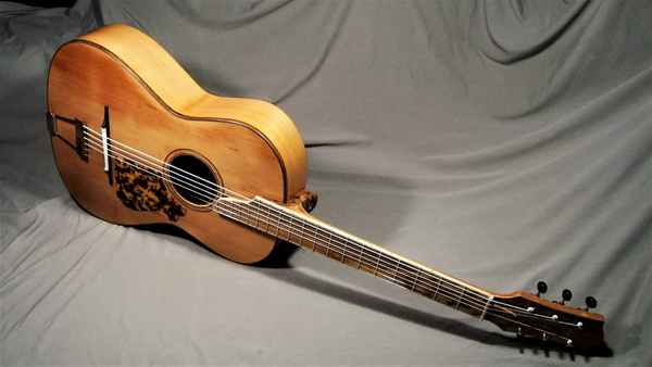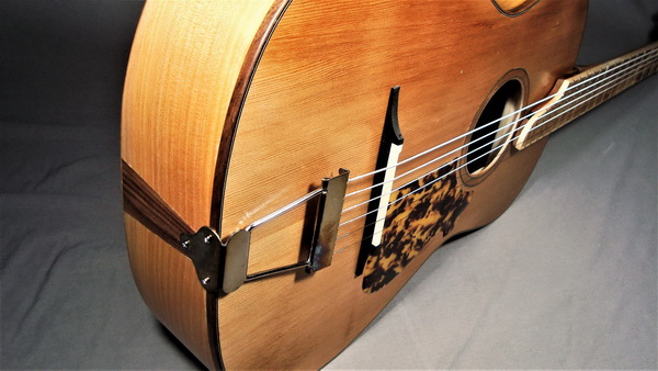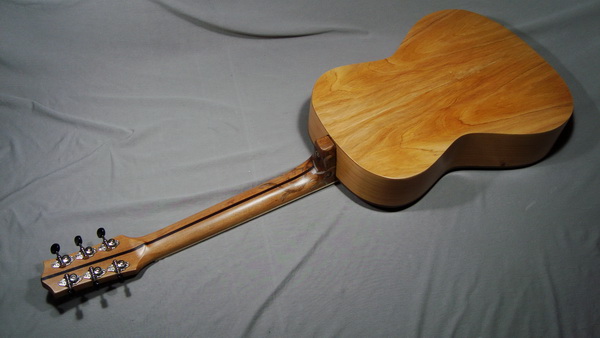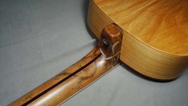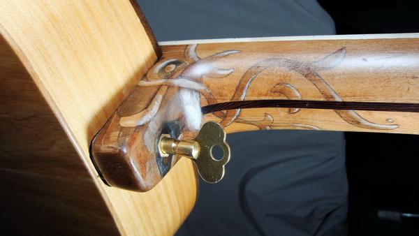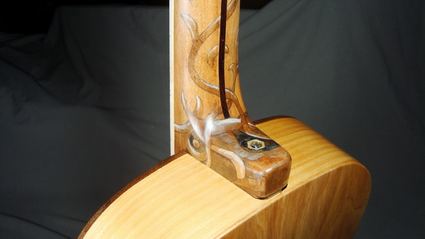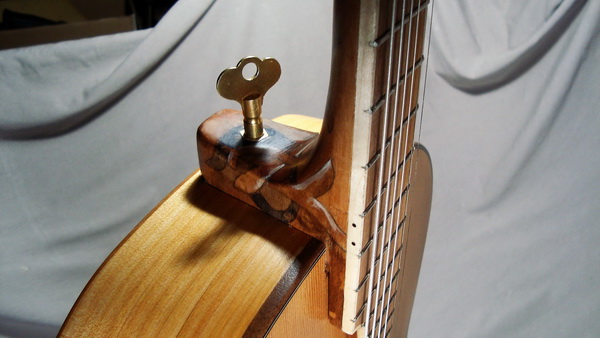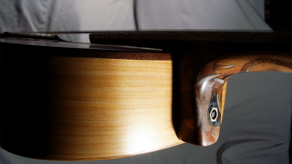 και κάλυμμα της βέργας από ελιά επίσης, ίσα που φαίνεται. Έκανα ένα κόλπο με προεξοχή από μέσα και δεν χρειάζεται βίδες, αλλά αν θες να το βγάλεις δεν χωράει να περάσει από τις χορδές, πρέπει να ξεκουρδίσεις μια από τις κεντρικές (την Ρε ή την Σολ) και να την τραβήξεις στην άκρη για να το βγάλεις για να έχεις πρόσβαση στη βέργα. Δεν με χαλάει, δεν πειράζουμε τη βέργα και κάθε μέρα.