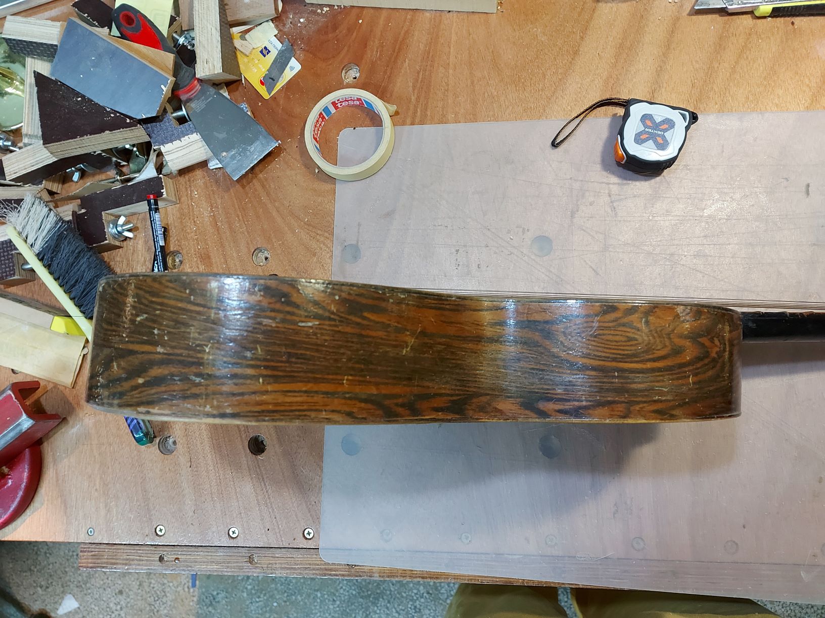 Δημήτρη, τώρα που το έχεις ανοιχτό μπορείς να καταλάβεις τον τρόπο δεσίματος του μπράτσου στον πάνω τάκο? είναι dove tail? πως σκέφτεσαι να ευθυγραμίσεις το μπράτσο? ρωτάω μήπως πρέπει τωρα που είναι ανοιχτη η κιθάρα να βγεί το μπράτσο.