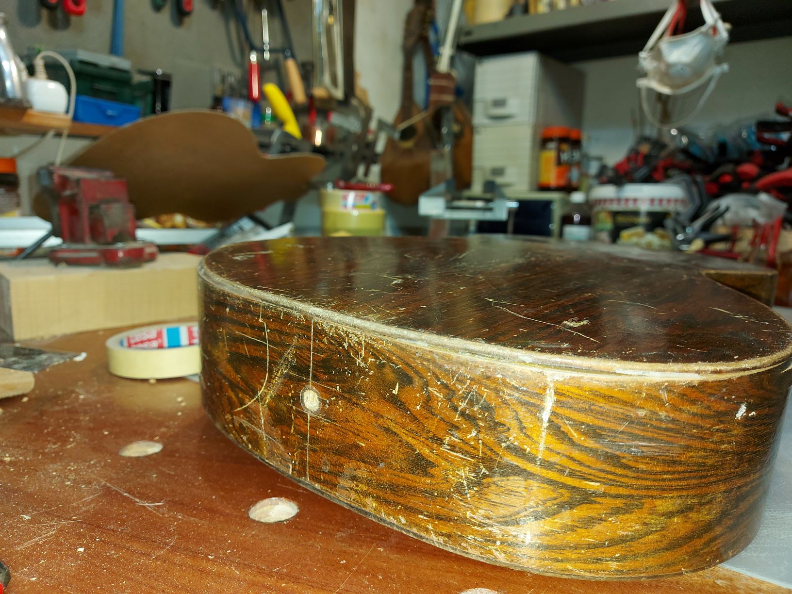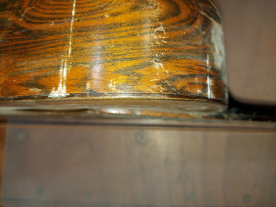 Το καπάκι έλατο book matched με λεπτή βένα και μόνο μια μικρή ανωμαλία δεξιά και αρίστερα της τρύπας (έχει και σχετική φωτογραφία). Σχισίματα και γδαρσίματα μέχρι και σχέδια από μολύβι. Πλάτη και πλαϊνά από ένα ξύλο με έντονα νερά. Η πλάτη μονοκόματη με πολλά γδαρσίματα. Η πρώτη αίσθηση ήταν ότι μάλλον πρόκειται για κόντρα πλακέ ντυμένο με καπλάμα. Τα πλαϊνά φαίνονταν να είναι ένα μονοκόμματο κομμάτι από το ίδιο υλικό με την πλάτη (καπλαμάς). Το μπράτσο και το καράολο βαμένα με αρκετά σημάδια από την φθορά του χρόνου. Στην πλατη και στα πλαϊνά σημάδια από κόλλες (τύπου ατλακόλ λευκή) που είχαν τρέξει.