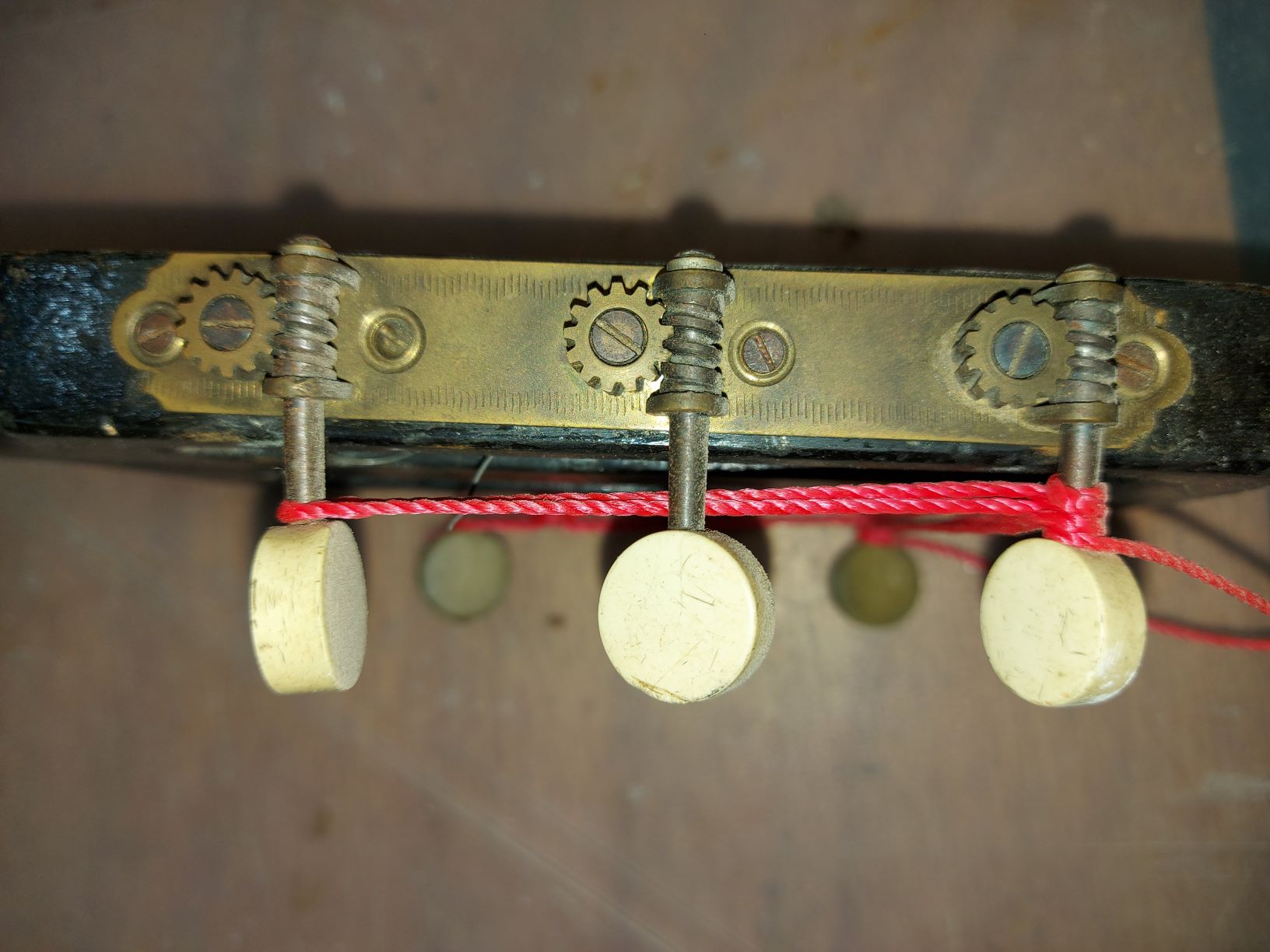 Στα καμαρια της πλατης οπου ειχαν ξεκολλλησει (κυριως στο κεντρο) ειχε γινει εδω και πολυ καιρο καθως ειχαν μαζεψει πολυ σκονη που ειχε μαυρισει σαν μουχλα. Οσο το κοιταω τοδο πιο πολυ μου φαινεται πως μιλαμε μαλλον για προπολεμικο οργανο. Τα ξυλα ειναι τελειως ξερα και παναλαφρα. Θελω να πιστευω πως αν τα καταφερω χωρις απωλειες στην εργονομικη επισκευη, το οργανο θα γλυκομιλησει.