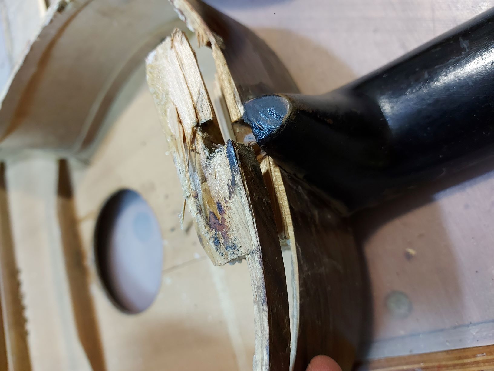 Κωστα δες μια φωτογραφια πως σηκωσα το καπακι. Αφου το στσθεροποιησα, κολλησα απο την μεσα πλευρα τα καμαρια, το ενα που εφυγε και προσθεσα και αλλα δυο περιμετικα της τρυπας. Φαινονται και οι ενισχυσειςπο εβαλα εσωτερικα στα σχισιματα στο καπακι. Θα επανελθω πιο αναλυτικα με τις εργασιες που εκανα.