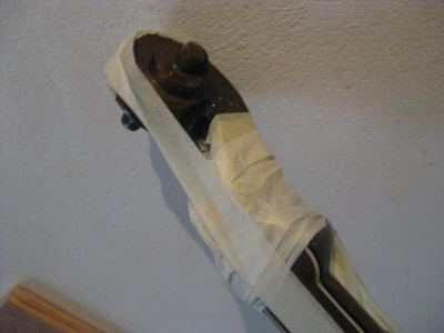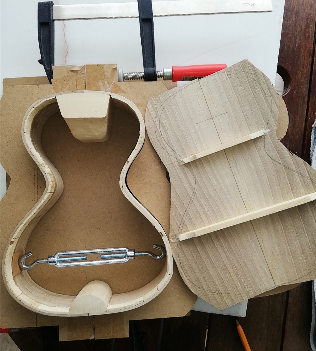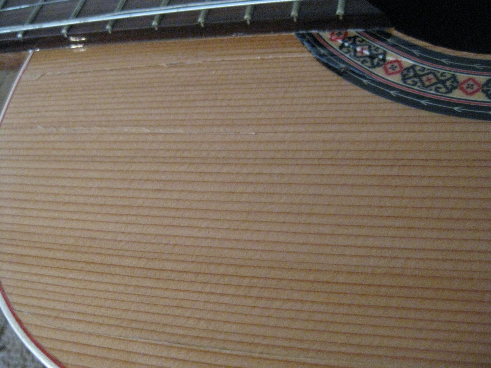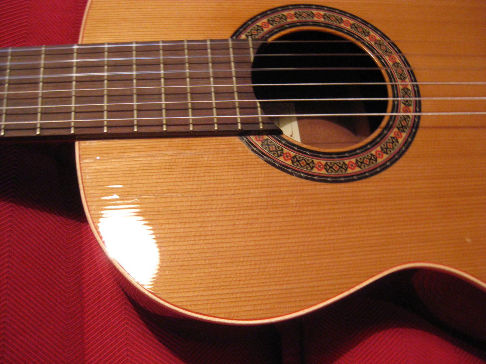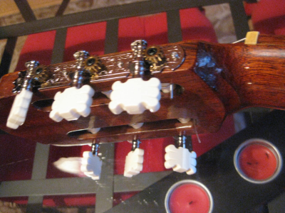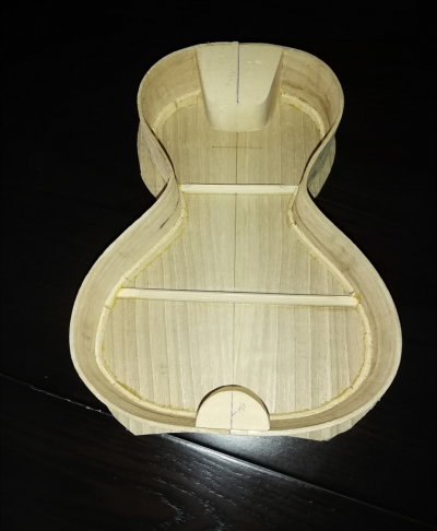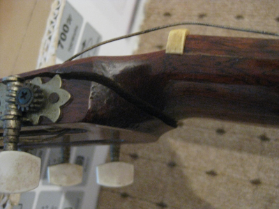αφου κολληθηκε το καμαρι (προσφατα ειχαμε κουβεντουλα...) με 3 σφικτηρες και τακακια δεξια αριστερα, κολληθηκαν λεπτα φυλλα ξυλου ελατινα στις σχισμες εσωτερικα με λεπτες καβιλιες να το σπρωχνουν, εγχύθηκε κολλα μια σταλια απο πανω πιο αραιη απλωθηκε ναϋλον και ενας καταληλος τακος στο σχημα απερ μπουτ (εκτος της ταστιερας φυσικα ) ηρθε και κουμπωσε , και ετσι εμεινε η καθε σχισμη στη "πρεσσα" μια με μιαμιση ωριτσα.
