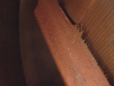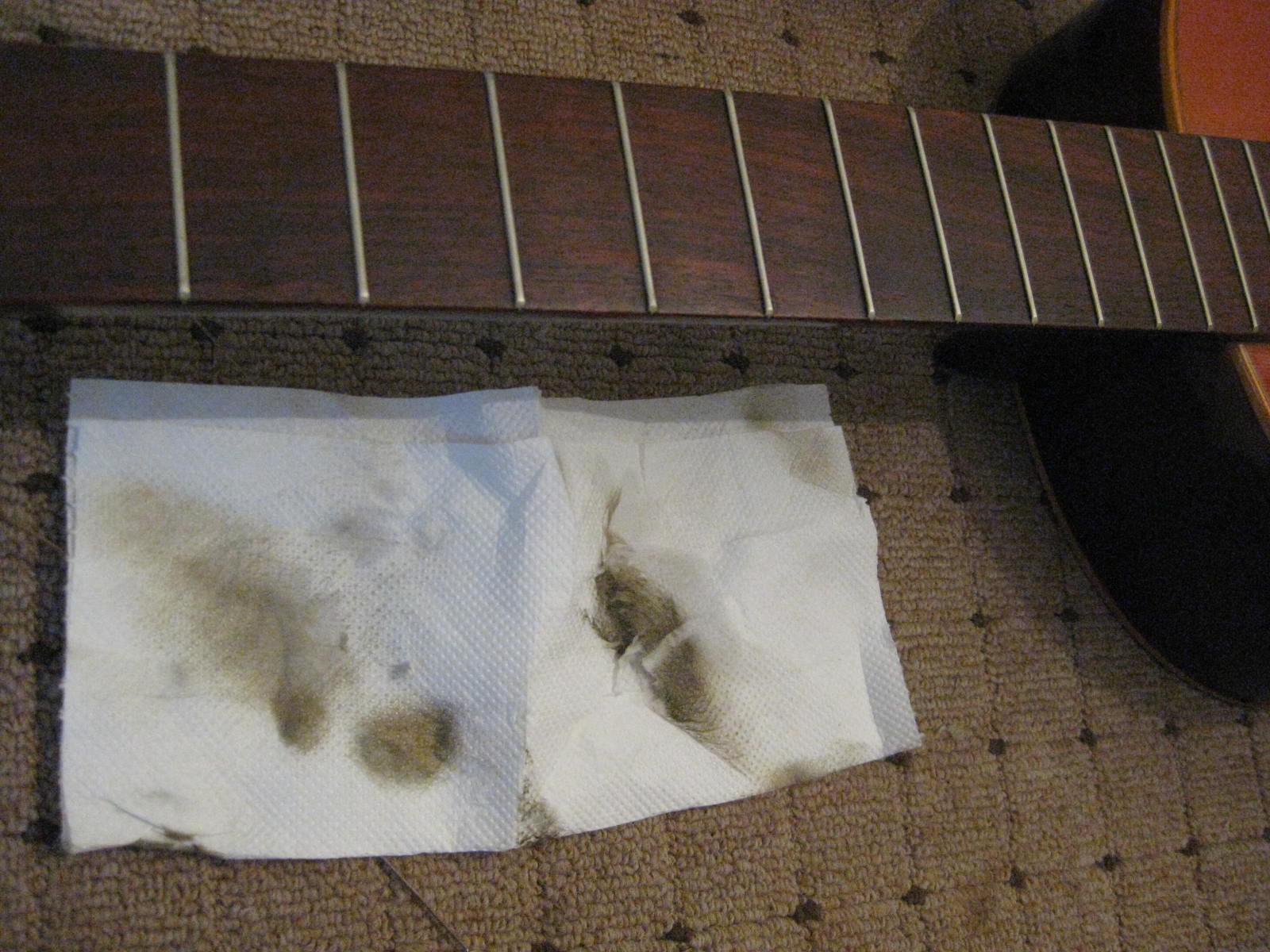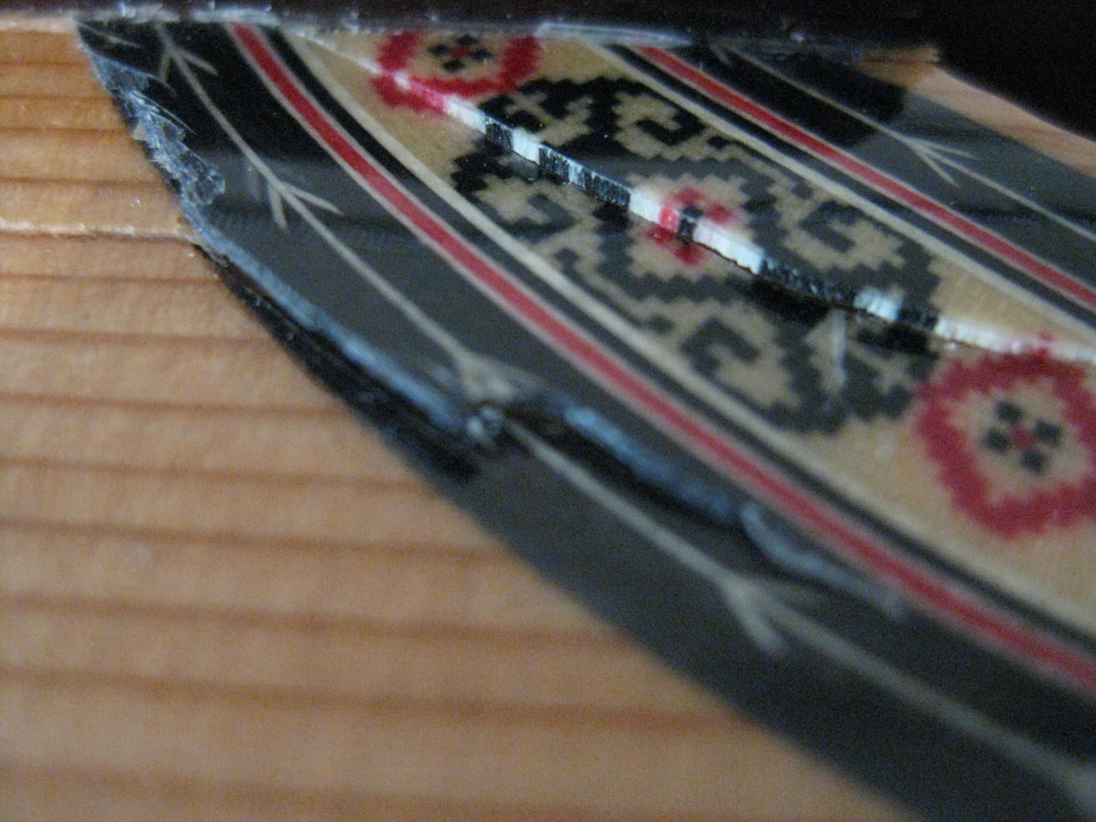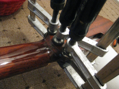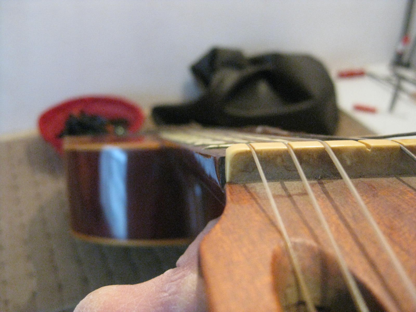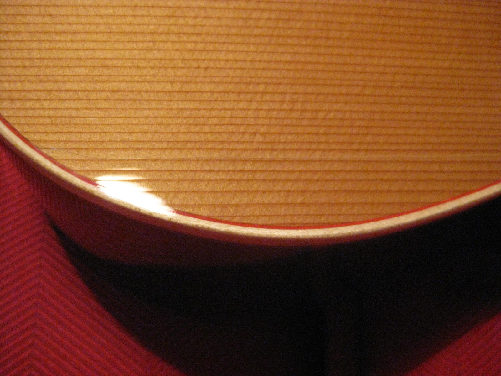 αφου κολληθηκε το καμαρι (προσφατα ειχαμε κουβεντουλα...) με 3 σφικτηρες και τακακια δεξια αριστερα, κολληθηκαν λεπτα φυλλα ξυλου ελατινα στις σχισμες εσωτερικα με λεπτες καβιλιες να το σπρωχνουν, εγχύθηκε κολλα μια σταλια απο πανω πιο αραιη απλωθηκε ναϋλον και ενας καταληλος τακος στο σχημα απερ μπουτ (εκτος της ταστιερας φυσικα ) ηρθε και κουμπωσε , και ετσι εμεινε η καθε σχισμη στη "πρεσσα" μια με μιαμιση ωριτσα.