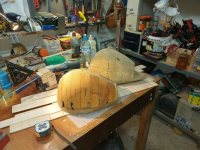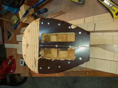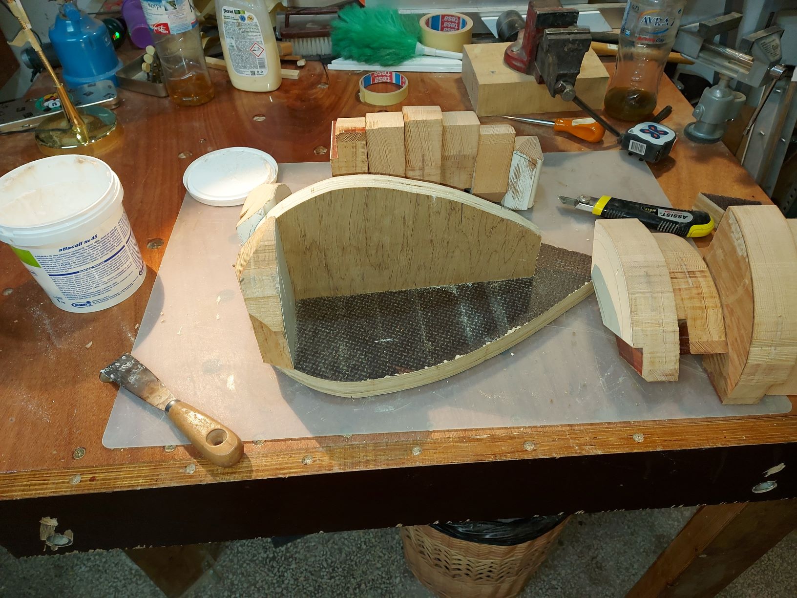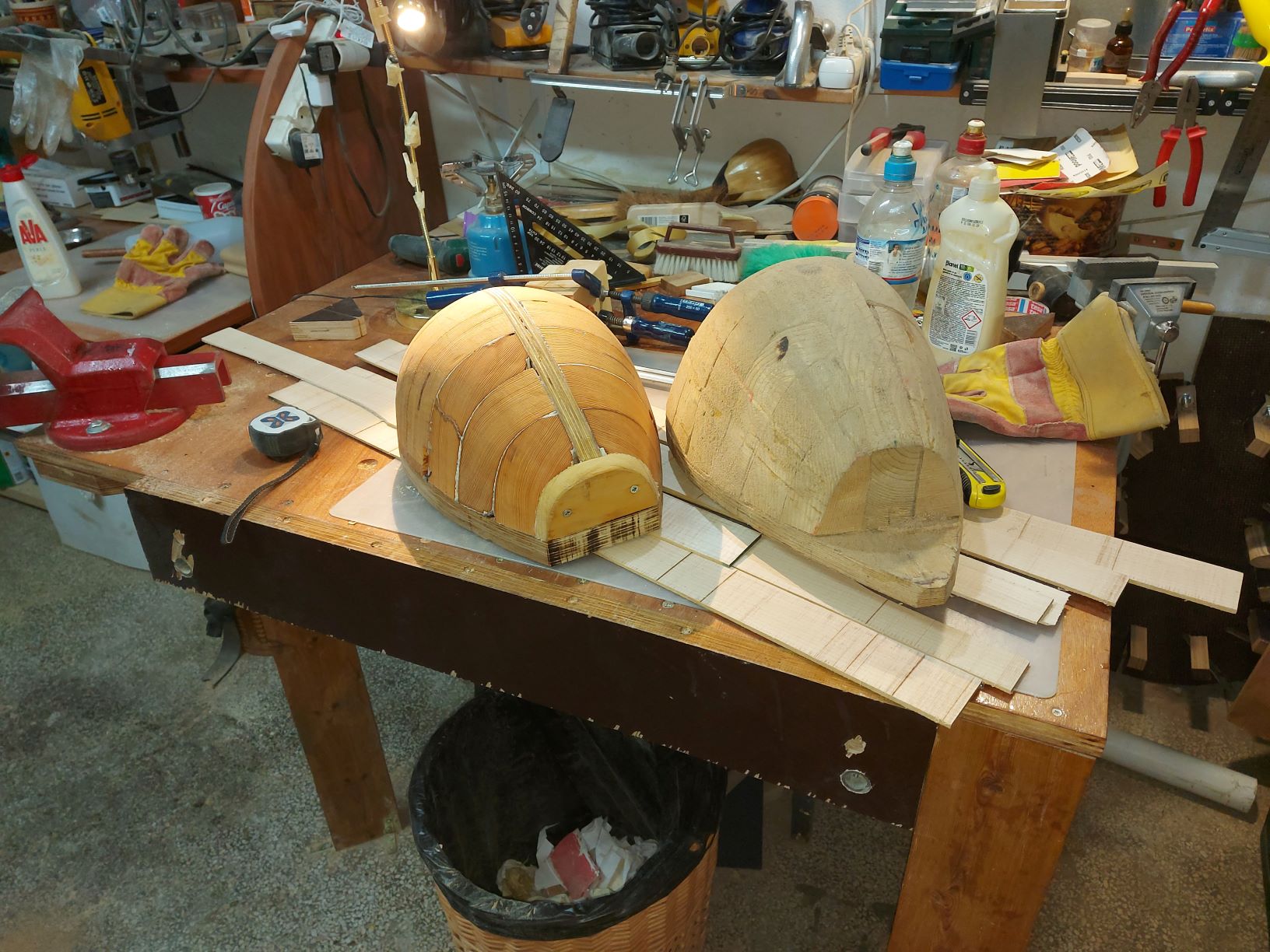Η αρχική ιδέα για το σκάφος ήταν να χρησιμοποιήσω ένα ωραίο κελεμεπάκι από το 2006 που είχα που όμως τελικά ήταν οριακό οπότε είπα να το κάνω το σκάφος δίχρωμο με κελεμπέκι και μια ελληνική καρυδιά από το 2007. Γύρισα λοιπόν τις ντούγιες και χτες πέρασα την ντουγομάνα.