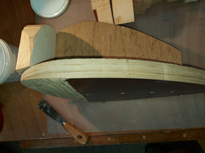 Το καλούπι φτιάχτηκε με κόντρα πλακέ θαλάσσης για την βάση και το χτίσιμο των νομέων με πεύκο από παλιά κουφώματα (εξ ου και το λευκό χρώμα που φαίνεται στην μία πλευρά. Τα καλούπια τα κάνω μασίφ. Πιστεύω πως παρά το βάρος έχει κάποια πλεονεκτήματα σε σχέση με τα καλούπια που έχουν κενά. Μέχρι τώρα όλα τα καλούπια μου ήταν πάνω σε κόντρα πλακέ θαλάσσης το οποίο ήταν ουσιαστικά η βάση και οι ντούγιες χτιζόντουσαν πάνω από το επίπεδο του κόντα πλακέ. Με το τρόπο αυτό μπορύσα να βαθαίνω κατ'ε πιλογήν το σκάφος χρησιμοποιώντας και βάθος που δίνει το επίπεδο του κόντρα πλακέ. Αυτήν την φορά όμως το καλούπι σχεδιάστηκε με την λογική ότι και το επίπεδο του κόντρα πλακέ χτίζεται με ντούγιες.