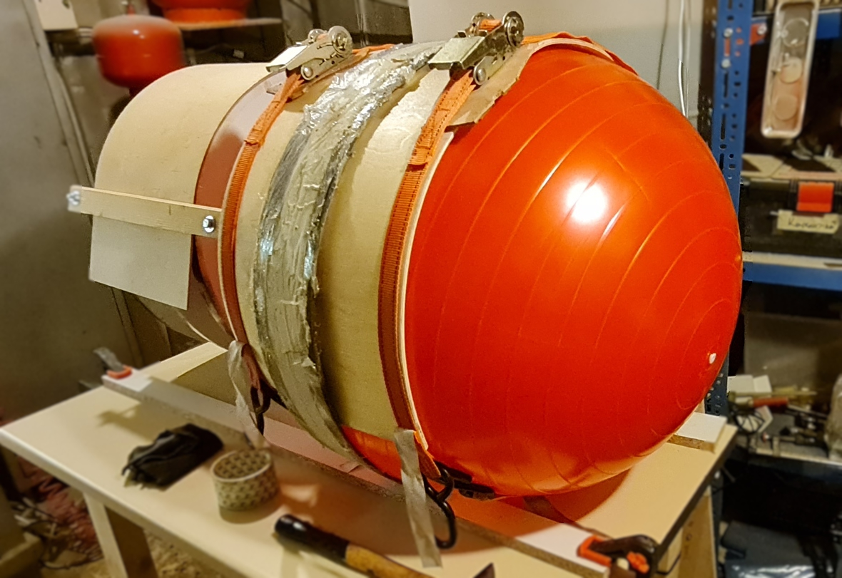 ... και για να εξηγήσω τι δείχνει η φωτό, το φύλλο μπήκε στο μεταλλικό στεφάνι που έχω για τα frame-drums και μια μπάλα γυμναστικής φουσκώθηκε με το κονφλέρ και πιέζει το φύλλο στο στεφάνι. Εύκολο και γρήγορο αν και επειδή είδα να σηκώνονται λίγο τα τμήματα που ήταν εκτός του στεφανιού, έσφιξα και δύο ιμάντες δεξιά και αριστερά, όπως δείχνει και η επόμενη φωτογραφία.