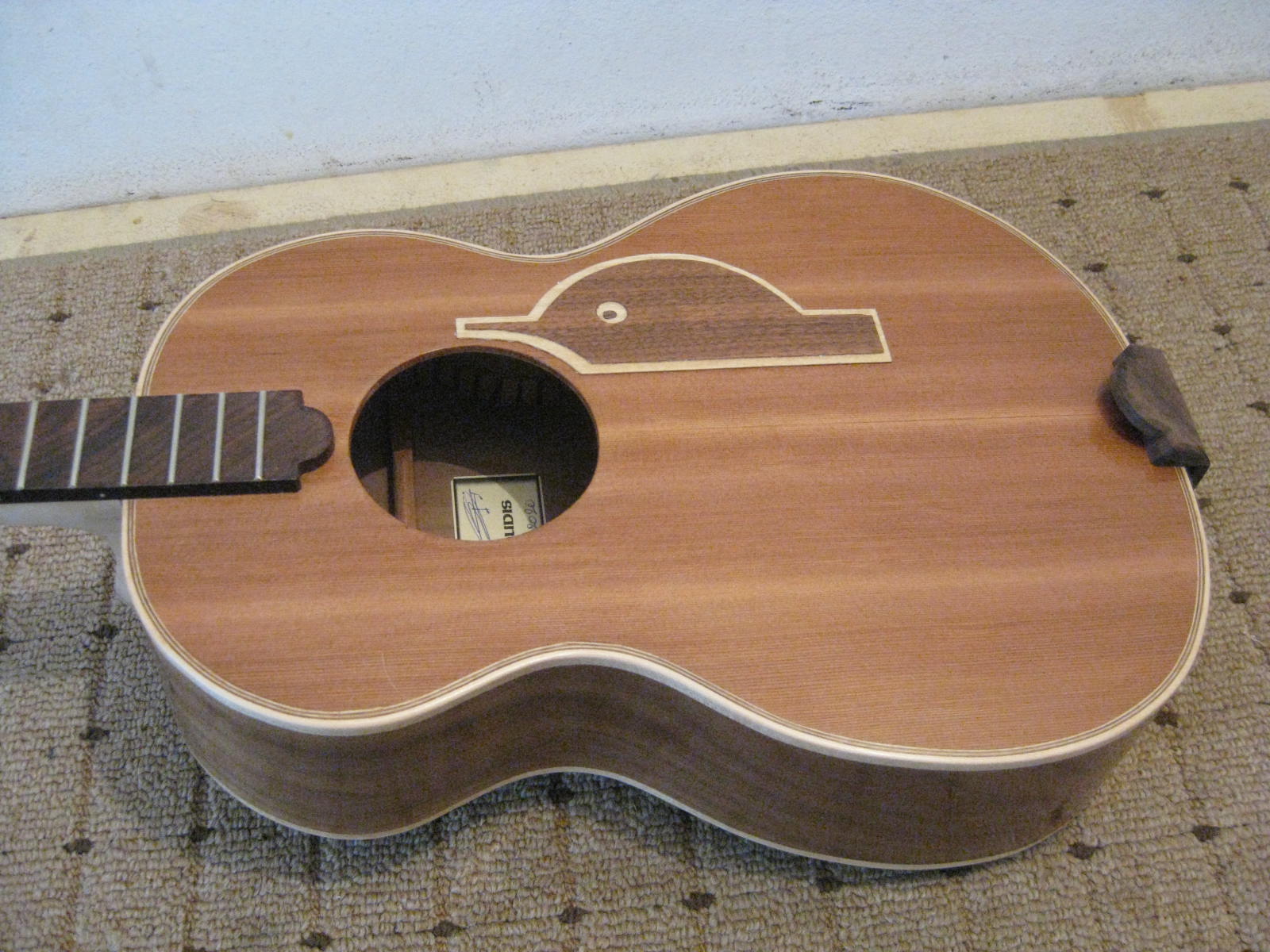 η κατασκευη τελος, θελει λιγο λουστρακι το πανω μερος της κατασκευης για τις χορδες και κολλημα (εχουν καθαριστει οι πατουνες εκει που ακουμπα στο καπακι)