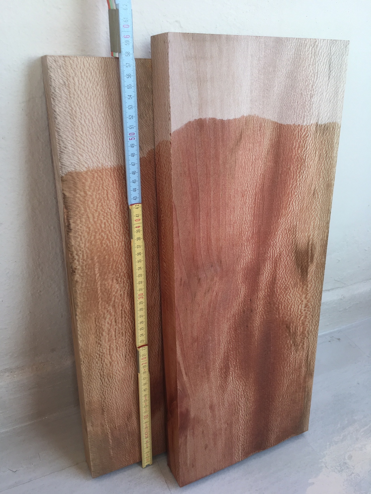 Είδα πολλές καλές σφήνες κορμών από έλατο Άλπεων που περιμένει να κοπεί για καπάκια. Είδα μεγάλους κορμούς από κέδρο (Αλάσκας όπως μου είπε) καθώς και κομμένα καπάκια κέδρου με πολύ καλά νερά. Είδα τα κλασσικά σφεντάμια, καρυδιές, μαόνια αλλά  και καραγάτσια και φλαμούρια, και λεύκα με σγουρά νερά (που δεν έχω ξαναδεί). Όλο και κάποιο θα ξεχνάω... Άκουσα ακόμη για καλή μουριά και για έβενο που είναι στο δρόμο. Είδα επίσης και πλατάνι με νερά που με εντυπωσίασαν, κάτι σαν Brazilian lacewood. Πήρα με 30 ευρώ δυο κομμάτια από αυτό το πλατάνι (ξαδελφάκι με το σφεντάμι που ως γνωστό λέγεται Acer pseudoplatanus).
