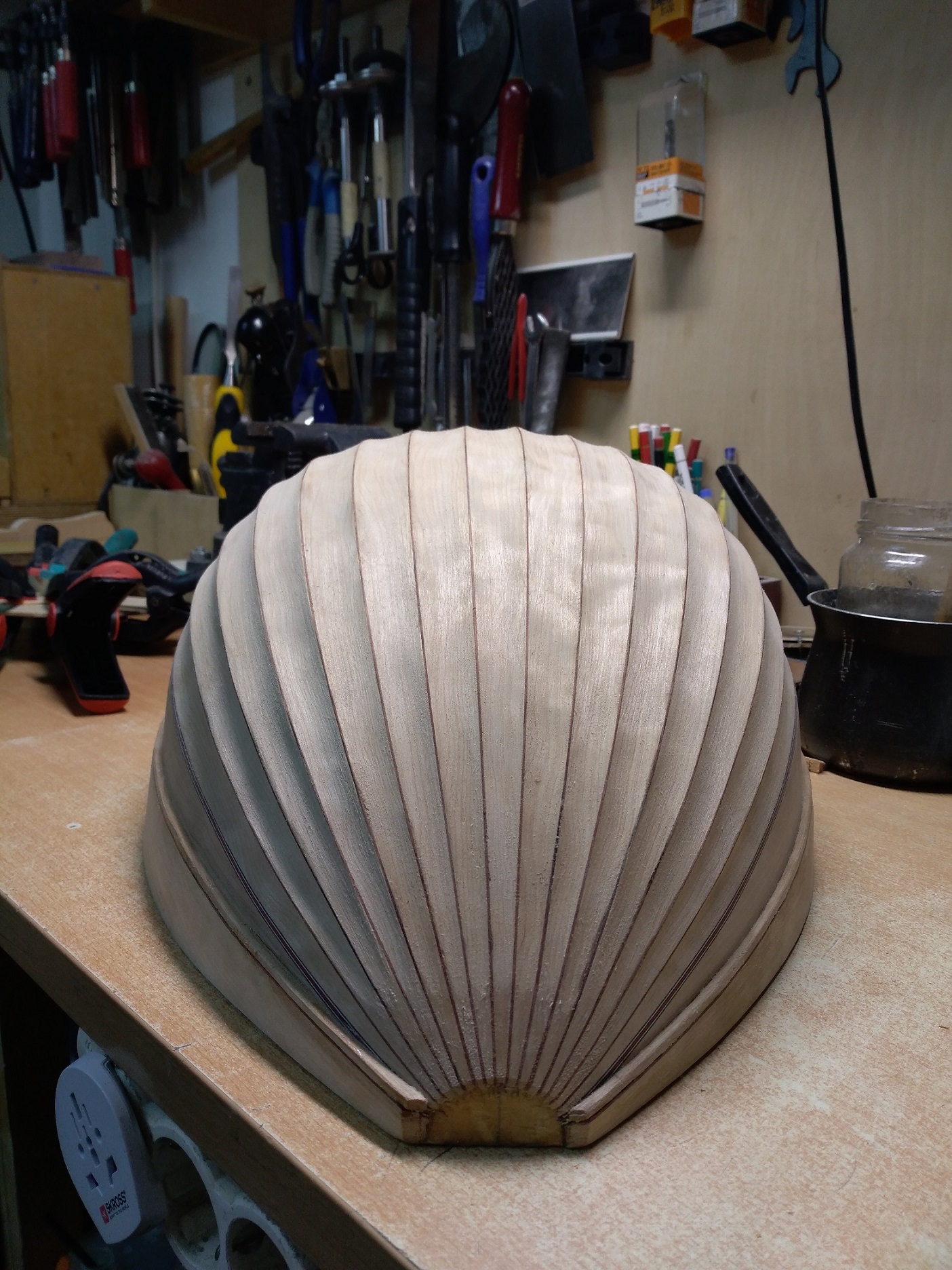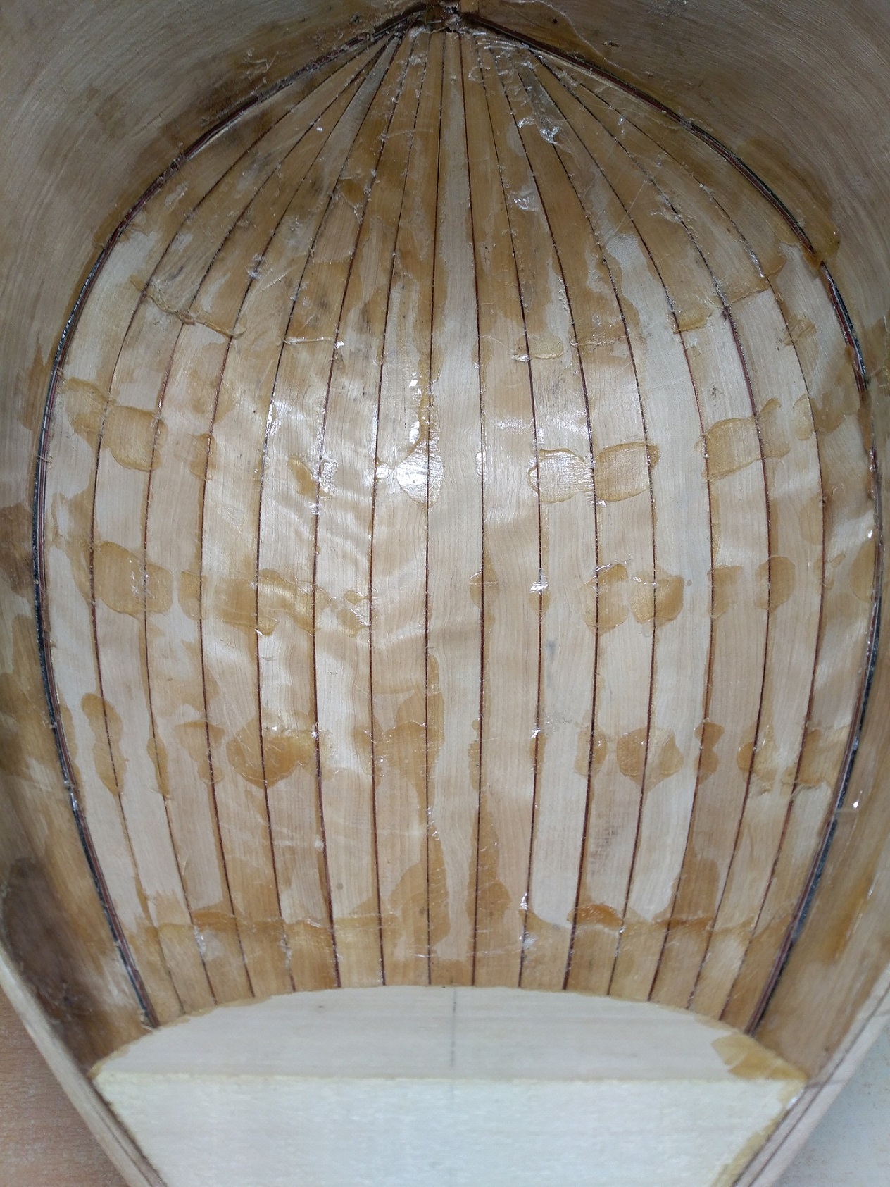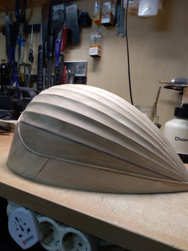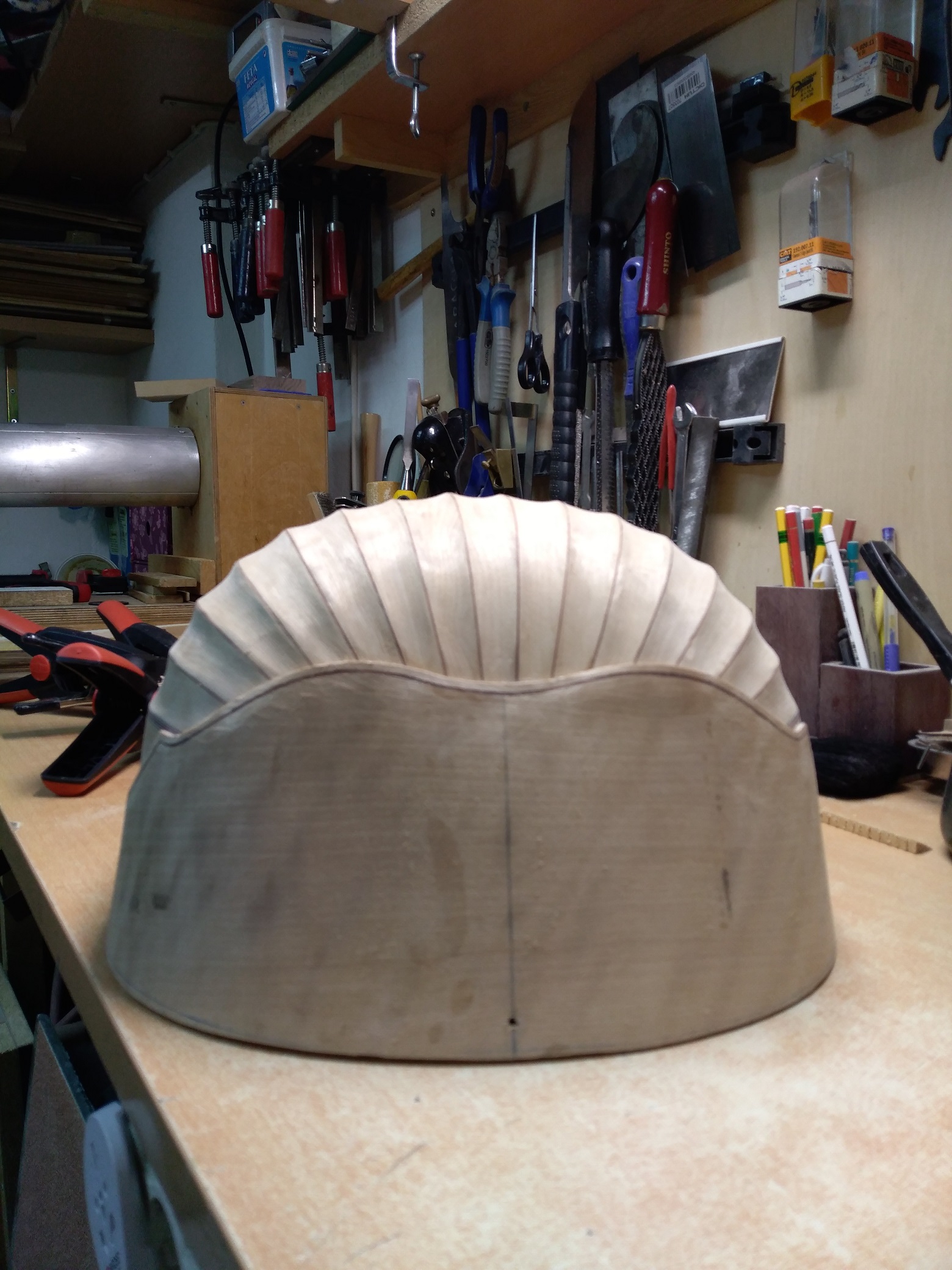 Σκάφος τετράχορδου από σγουρή σημύδα με σκαφτές δούγες. Αρχικό πάχος δούγας 3,2 χιλιοστά. Εύκολο ξύλο στο λύγισμα αλλά λόγω του σγουρού που έχει μέσα κάνει αρκετές στρεβλώσεις οπότε ήθελε αρκετά μεγάλη προσοχή στη διαμόρφωση δούγας με δούγα. Έχει γίνει ένα αρχικό τρίψιμο με 80άρι γυαλόχαρτο οπότε θέλει ακόμα φινίρισμα. Τα νερά του δεν φαίνονται εδώ πολύ καλά, αλλά μόλις πέσει σίλερ και λούστρο είναι πανέμορφο σε κομμάτι που δοκίμασα. Μόλις το ολοκληρώσω και φανεί θα το ξαναδείξω.