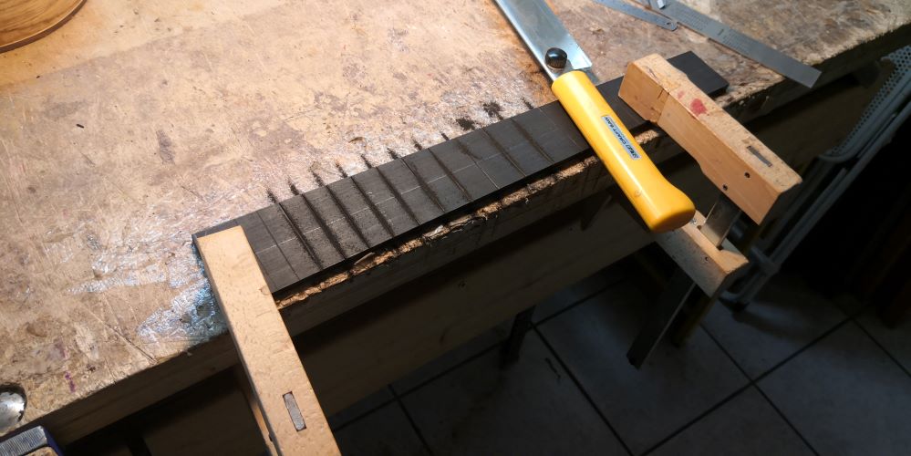 Με μικρότερο πριόνι χειροτεχνίας κάνω πρώτα μικρή κοψιά αριστερά και μικρή κοψιά δεξιά υπό γωνία. Μετά ενώνω τις δυο κοψιές και προχωρώ λίγο βαθύτερα. Αφού γίνει το βασικό κανάλι μέ το μικρό πριόνι, προχωρώ με το κανονικό πριόνι.