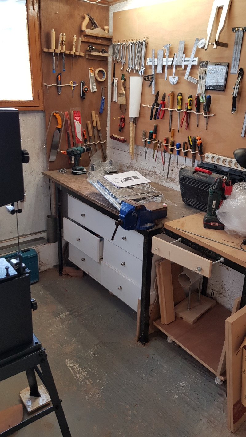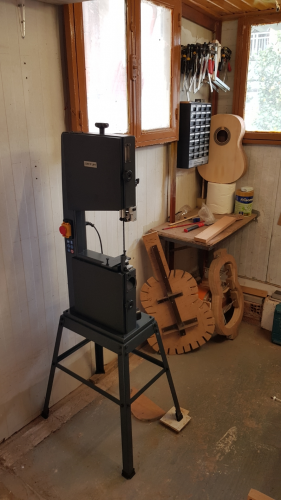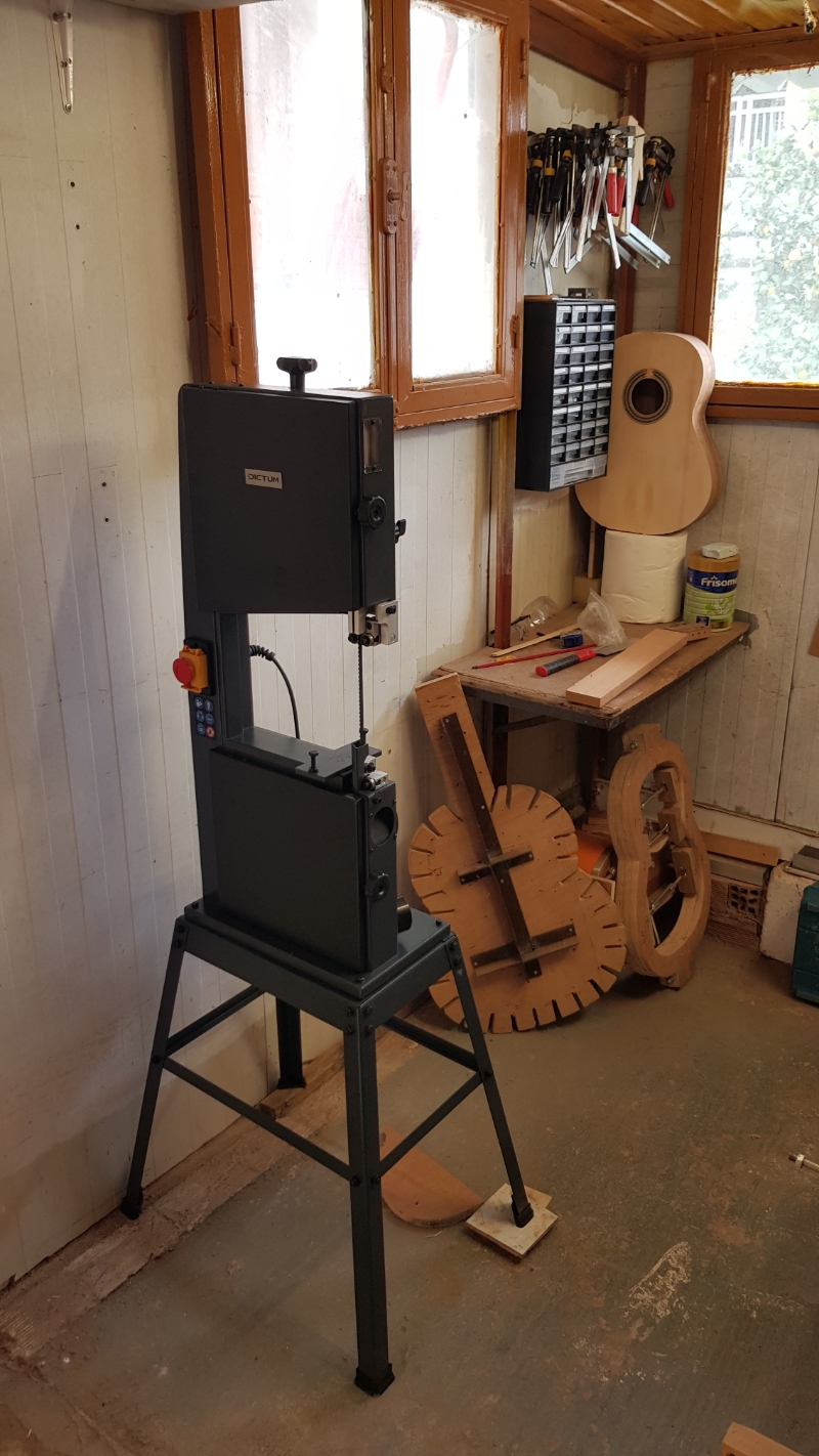 Το εργαστήριο τακτοποιηθηκε..Και η νέα πριονοκορδελα στήθηκε.. Όταν ξαναπάω στο σπίτι μου θα ρυθμιστεί και θα δοκιμαστεί.. οι πληροφορίες από τον Βορρά λένε ότι πρόκειται για φοβερό εργαλείο στο μέγεθος του..για ερασιτεχνική χρήση.. αν αγοράζεις μαδερια παλισανδρου για να βγάλεις πλάτη κιθάρας και κορμούς για καπάκια, τότε ΔΕΝ κάνει..